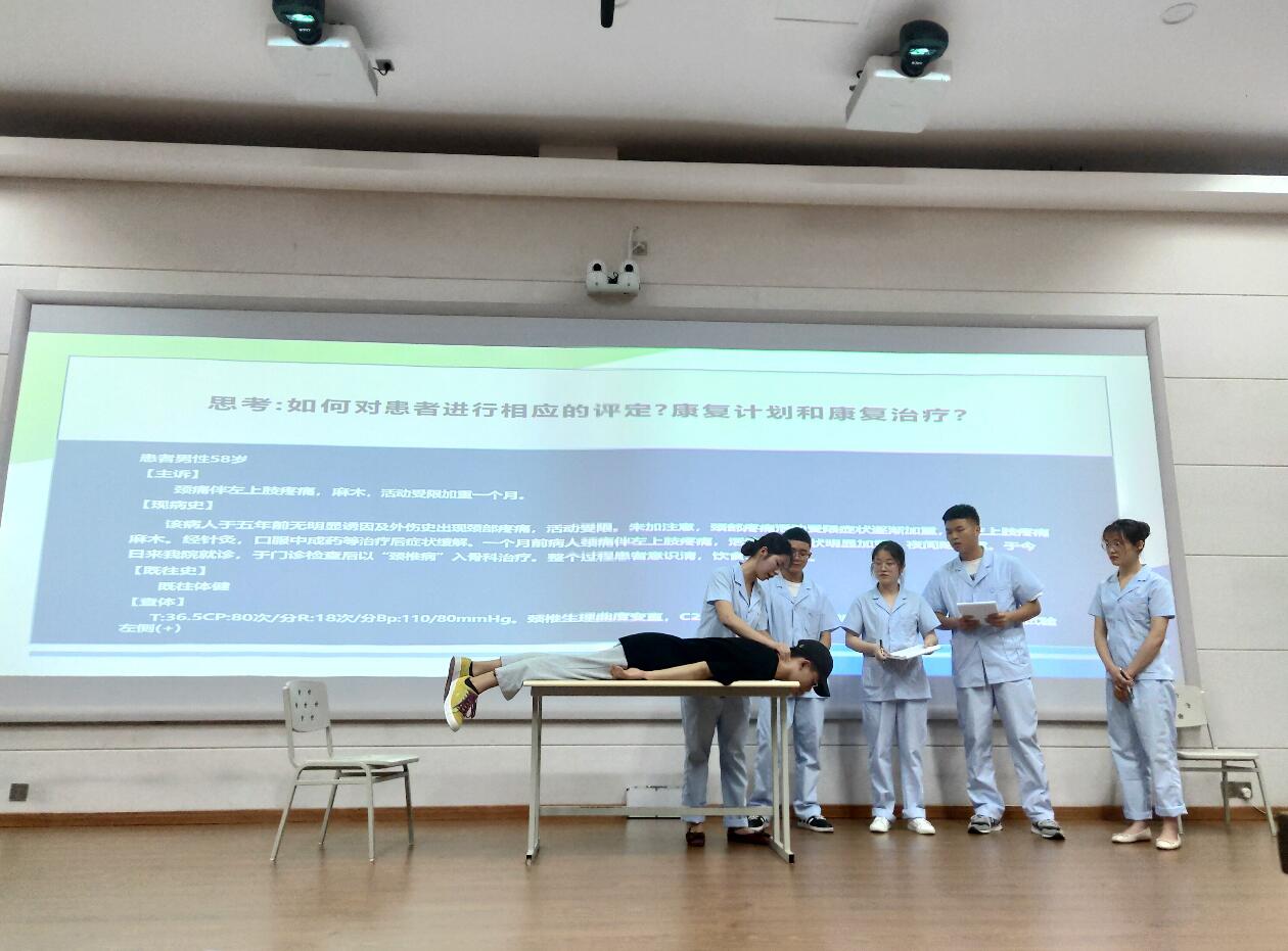 经过前期的初赛,康复组有三组选手、中医组有六组选手进入决赛。康复组率先挑战,在问诊、评估、评定、制定治疗计划四个环节选手们进行了操作演示和比拼,评委老师们对各组表现给出了公正评分和精准点评,加深了大家对操作过程的认知。随后是中医组的知识竞赛抢答,共两轮,每轮二十道题目,选手们争先恐后的抢答,展现了同学们扎实的专业知识储备。