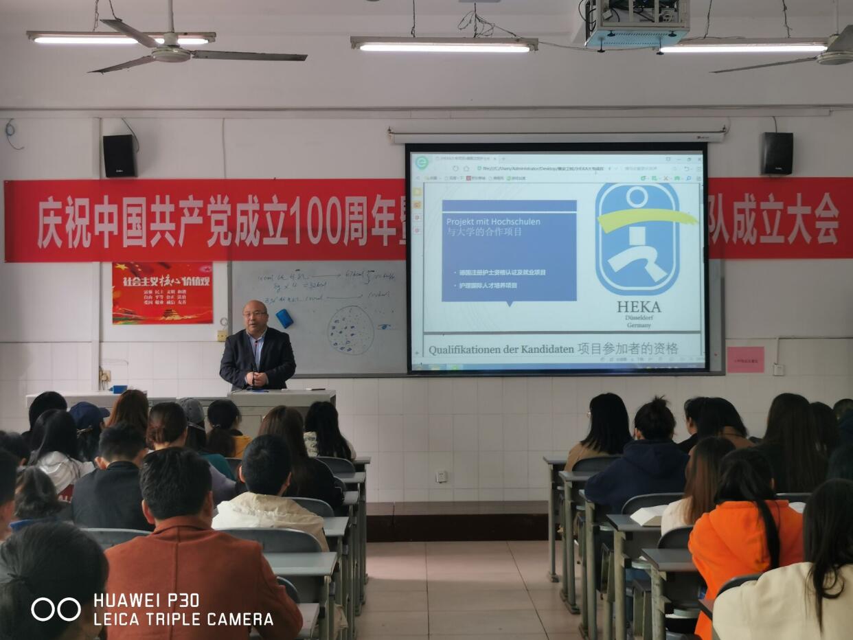 在学院党委的领导和支持下,护理学院与德国亨嘉国际教育有限公司经过前期的沟通协调,本学期启动了中德护理人才培养项目项目,制定了合作计划书。4月14日下午,公司负责人杨杰和项目负责人唐老师一行来到学院,在育才路校区实验楼101举行了项目启动宣讲会,并组织了2021届护理专业毕业生160余人和辅导员、学管老师参加。会议由护理学院院长王静主持。