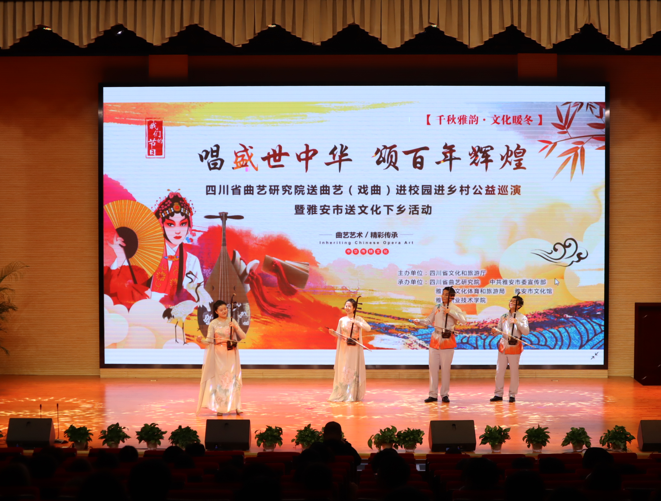 12月7日,由四川省文化和旅游厅主办,四川省曲艺研究院、中共雅安市委宣传部、雅安市文化体育和旅游局、雅安市文化馆和Beat365唯一官方网站联合举办的“唱盛世中华,颂百年辉煌”戏曲进校园巡演活动在我院经开校区聚雅厅顺利举行,200余名师生到场观看。