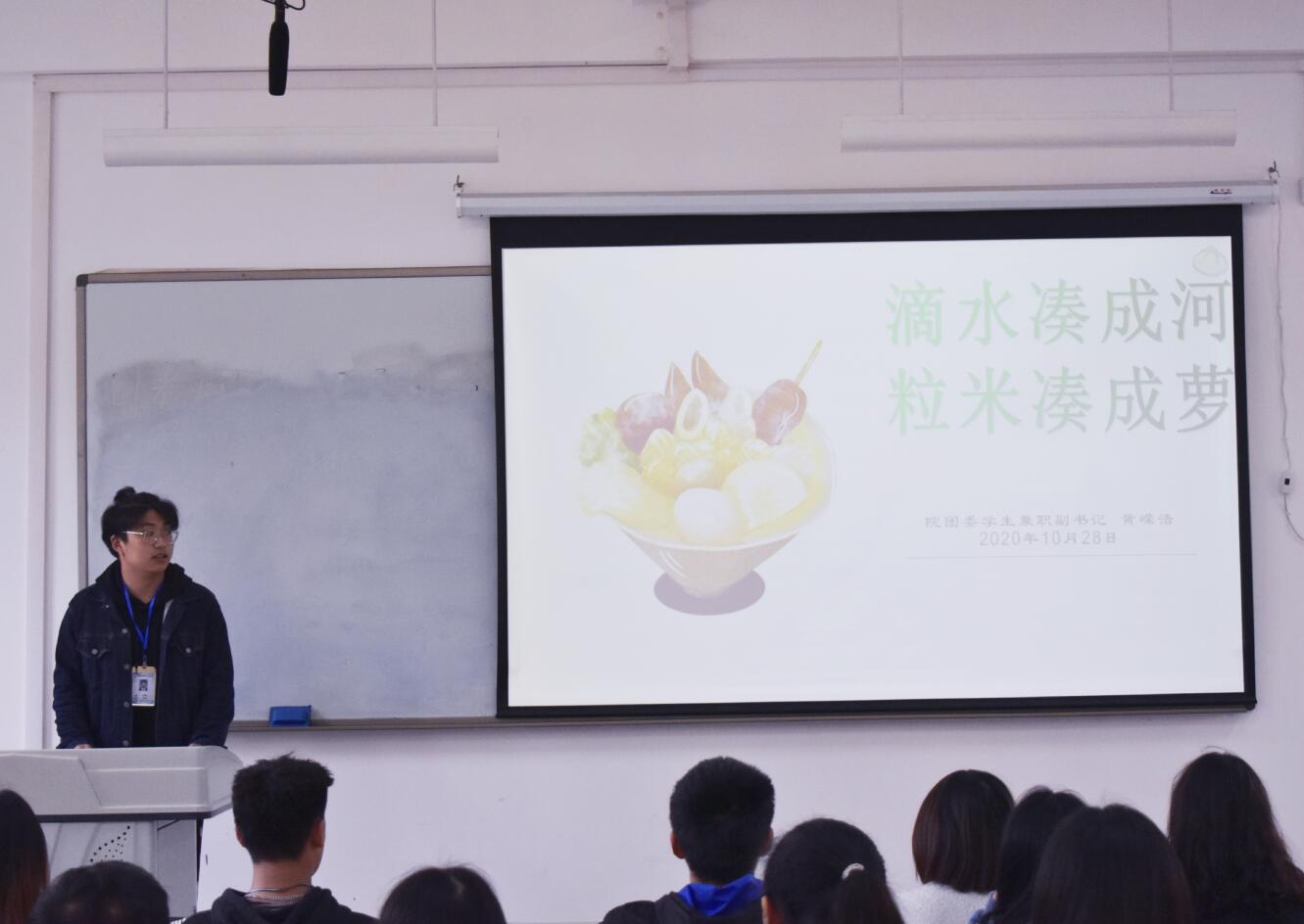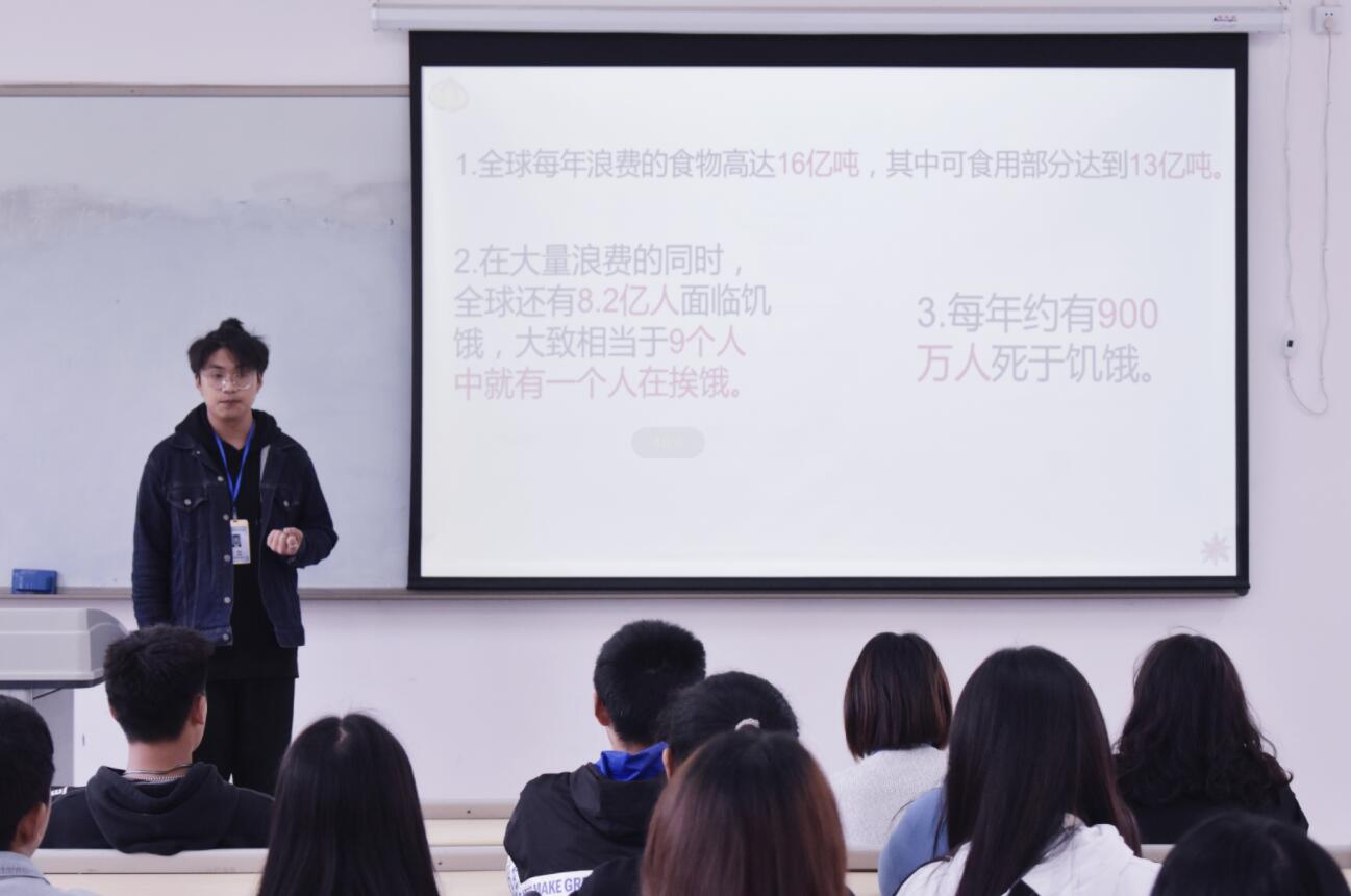 本期讲师团活动,学生黄嵘浩带来了主题为《滴水凑成河,粒米凑成箩》的演讲。节约粮食本是中华民族的传统美德,但目前浪费粮食的现象普遍存在,作为青年大学生,应该响应“吃多少,打多少,珍惜食物,杜绝浪费"的号召,把口号践行到实际行动中。一粥一饭,当思来之不易,节约粮食从你我做起,广大青年应该同心协力,用实际行动参与到节约粮食的活动中来,做勤俭节约风尚的传播者、实践者和示范者。