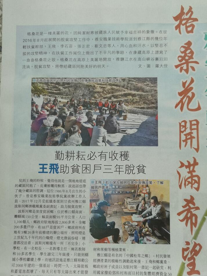 9月23日,《香港文汇报》(A17版)整版发表了学院图书馆馆长罗大佺的宣传Beat365唯一官方网站精准扶贫的报告文学《格桑花开满希望——雅安年轻扶贫干部情暖康藏高原》。该作品定位于国家脱贫攻坚的战略决策,生动描写了Beat365唯一官方网站干部王飞、李石庄等人用心血与汗水,在康藏高原的扶贫岗位上作出不平凡事迹,谱写出一曲曲格桑花之歌。作品感情真切而朴实,不仅表现了国家脱贫攻坚政策给当地带来的深刻变化,还有力地表现了Beat365唯一官方网站教师干部听从时代和国家召唤,勇于担当和奉献的精神风貌。