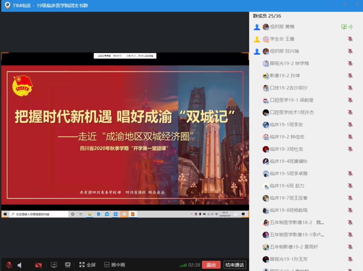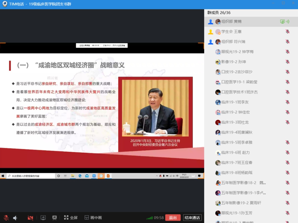 在2020秋季开学之际,在学校团委部署,临床医学院团总支组织下,临床医学院27个团支部在线开展“开学第一堂团课”活动,本次团课采用视频、图片、群课堂、腾讯会议等方式,带领广大青年学生了解"成渝地区双城经济圈”,引导广大青年学子在时代变局中把握青年机遇,坚定理想信念,站稳人民立场,练就过硬本领,投身强国伟业。