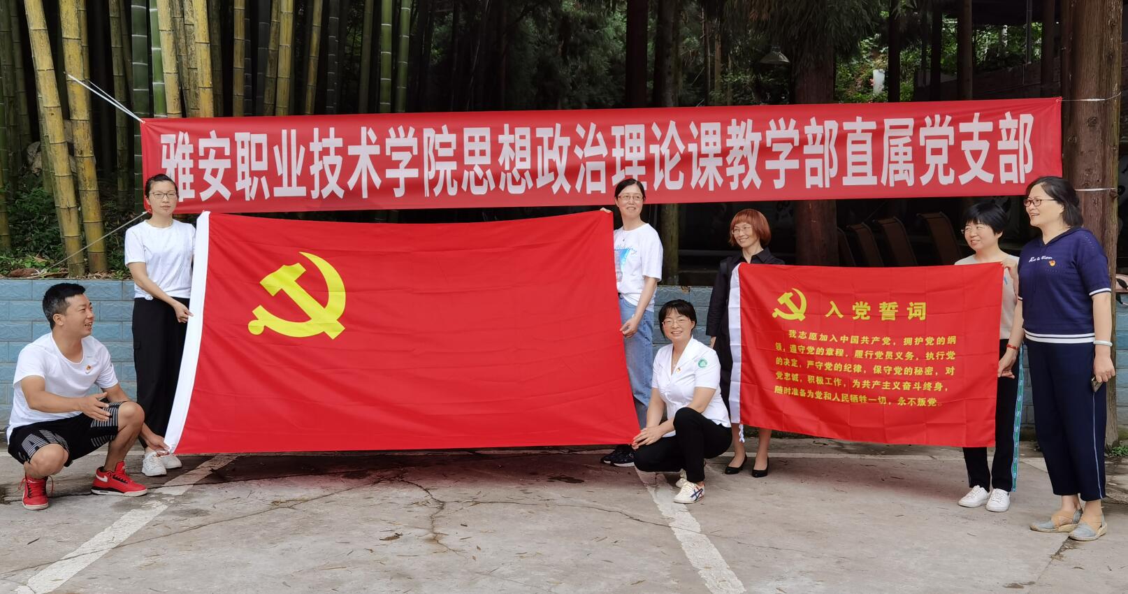 参观茶史馆后,党支部开展了庆祝建党99周年的“主题党日”活动。活动中,李霓带领所有党员老师重温了入党誓词,组织委员何衡同志以《红色文化在雅安》为题开展了专题党课讲座。讲座主要从红军在雅安长征的过程、红四方面军南下、雅安红色文化的历史地位三个方面进行讲解,让党员老师对雅安的红色文化有了系统的了解,并得到了深刻的启示。讲座结束后,党支部副书记、纪检委员吕登蓉领学了《中国共产党支部工作条例(试行)》《中国共产党纪律处分条例》《2020年政府工作报告》等内容。学习完成后,根据学习内容由任红静同志主持开展了有关学习内容的知识抢答。李霓总结安排了近期支部、部门重点工作。体育老师何莉同志带领全体党员教师齐跳健身操。
