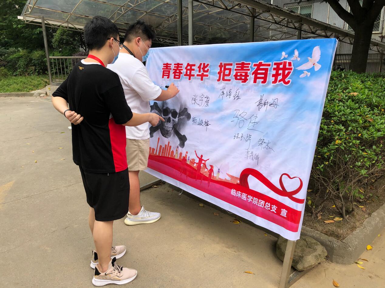 此次活动分为线上线下两种方式,线上采用安全教育网络一体化教学模式,通过QQ群组织各团支部在线观看禁毒公益微电影—《悔恨》,利用墙报,主题班会等方式开展专题安全教育。线下临床医学院学生会在宿舍楼下设置“青春年华,拒毒有我”签名墙等,鼓励同学们参与签名活动,表达拒绝毒品,珍爱生命的决心。