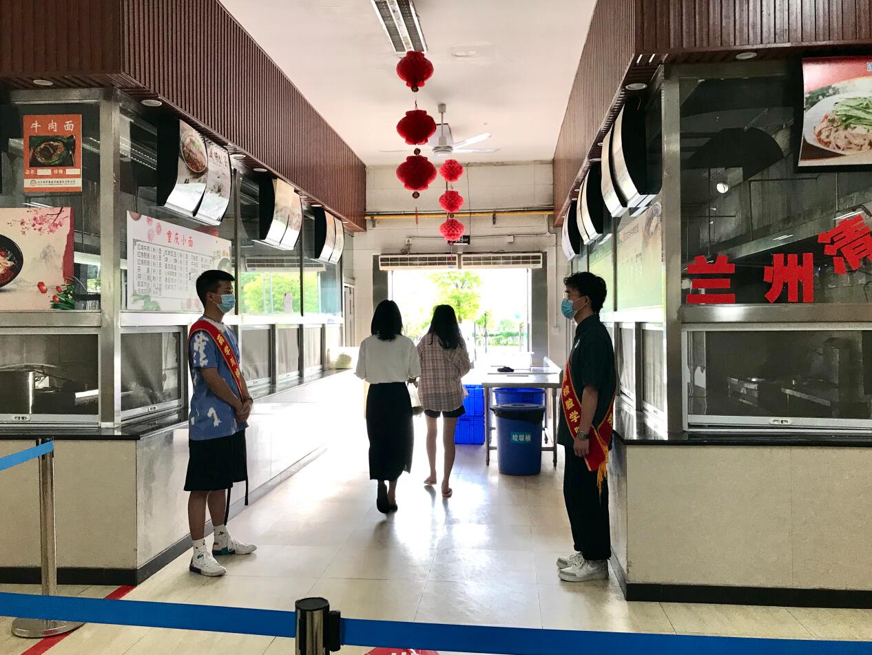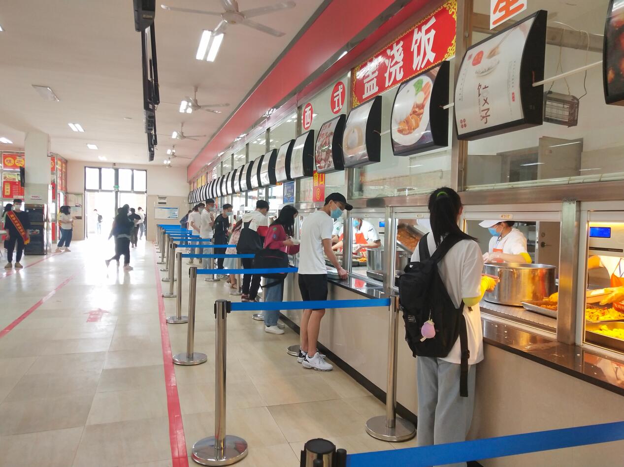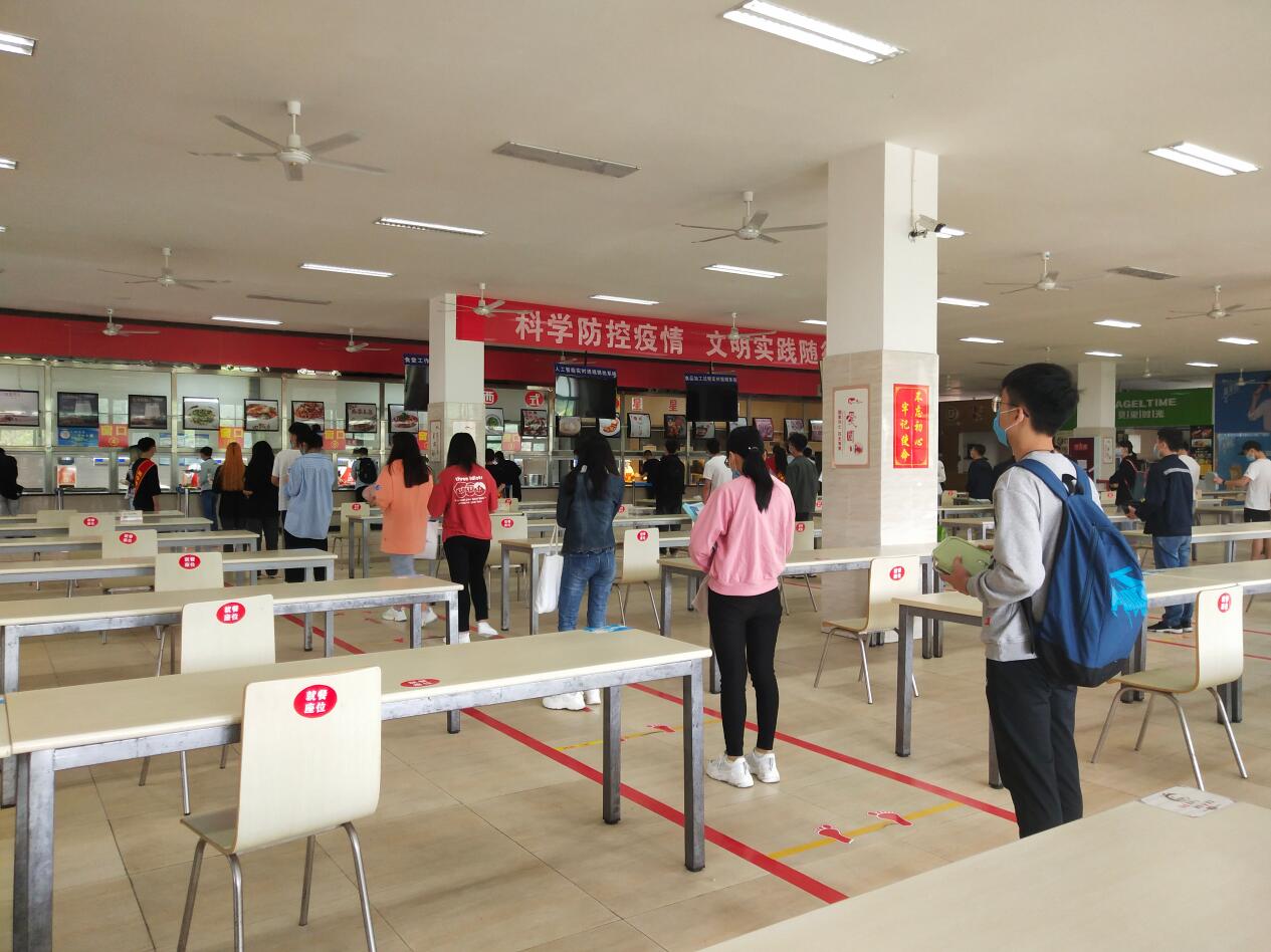 为确保同学们在校期间的有序就餐,学生分专业、分批次错峰就餐,在食堂采取“前门进,侧门出,堂食一桌一人,排队间隔1.5米,自带餐具,测体温,戴口罩”等措施,对疫情期间食堂就餐做出明确规定。20名志愿者们在值班老师的带领下,精神饱满地坚守在各自岗位中,细致地维持着就餐秩序,提醒和引导同学们文明就餐,根据食堂内的就餐入座率和排队情况,及时提醒场外志愿者组织食堂外同学排队,避免扎堆等不文明现象的发生。通过志愿者们的共同努力,为师生校园就餐筑起了一道坚实的安全防线。