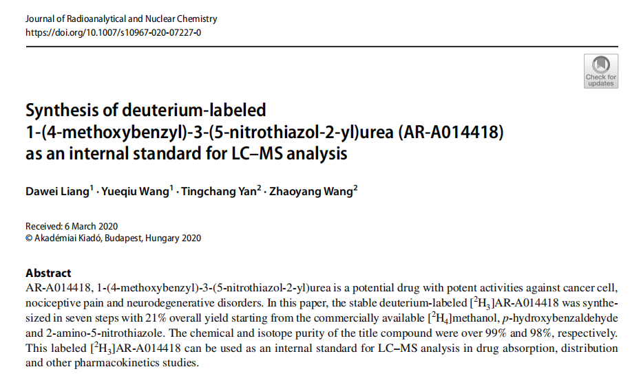 近日,我院药检学院副院长梁大伟在稳定同位素标记药物合成方面取得新进展,相关成果以题“Synthesis of deuterium-labeled 1-(4-methoxybenzyl)-3-(5-nitrothiazol-2-yl)urea (AR-A014418) as an internal standard for LC–MS analysis”发表于SCI刊物《Journal of Radioanalytical and Nuclear Chemistry》(DOI: 10.1007/s10967-020-07227-0)。Beat365唯一官方网站为论文第一单位,梁大伟教授为论文第一作者。
