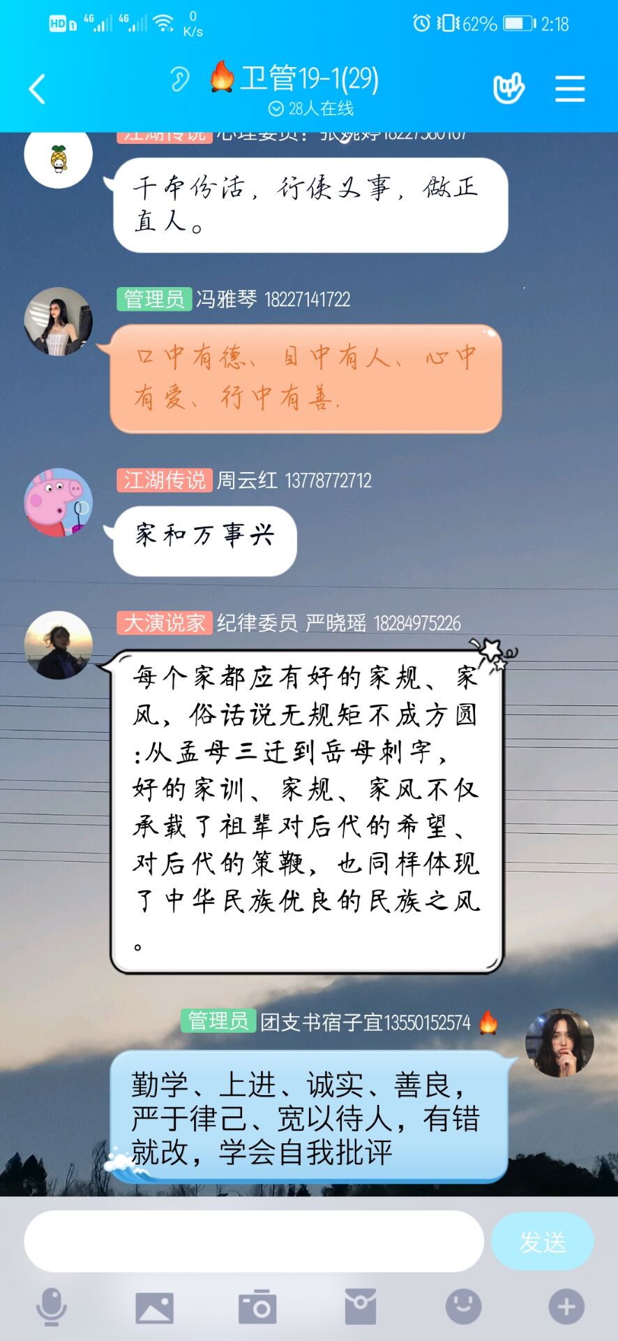 5月31日,智信学院团总支组织开展“我的家规家风故事”线上活动,青年团员纷纷挖掘家族长辈在修身律己、崇德向善、尊老爱幼、礼让宽容、文明和谐等方面的好经验、好做法,将一个个温馨、感人的故事,通过线上分享给同学们,讲述家风家规对自己成长的影响。卫生信息管理2019级1班宿子宜结合疫情小故事分享到她的家风家规:见利思义,见水思源,见难思忠,见德思贤。在交流讨论中同学们也感受到好家规家风的形成决非一朝一夕之功,需要有意识的去培育、去营造,才能为社会建设提供满满正能量。