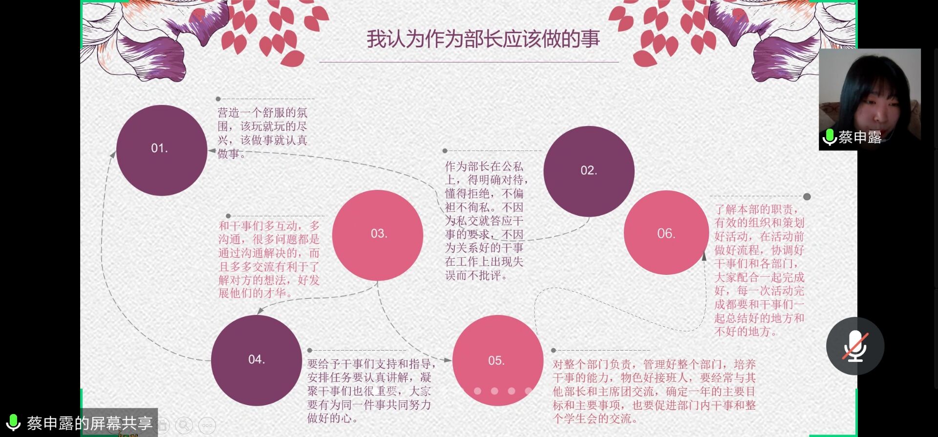本次竞选主要面向2019级学生会的干事,竞选的主要职位有分管团委和学生会的副书记、学生会主席及副主席、学生会各部门部长。竞选者通过线上视频连接按抽签顺序与评委们进行一对一的竞选演讲,通过PPT投屏从自身的优势、竞选岗位的职责认识、未来工作思路以及工作规划等方面进行演讲,演讲完毕后还进行了才艺展示,最后完成评委老师和各位部长提问环节。