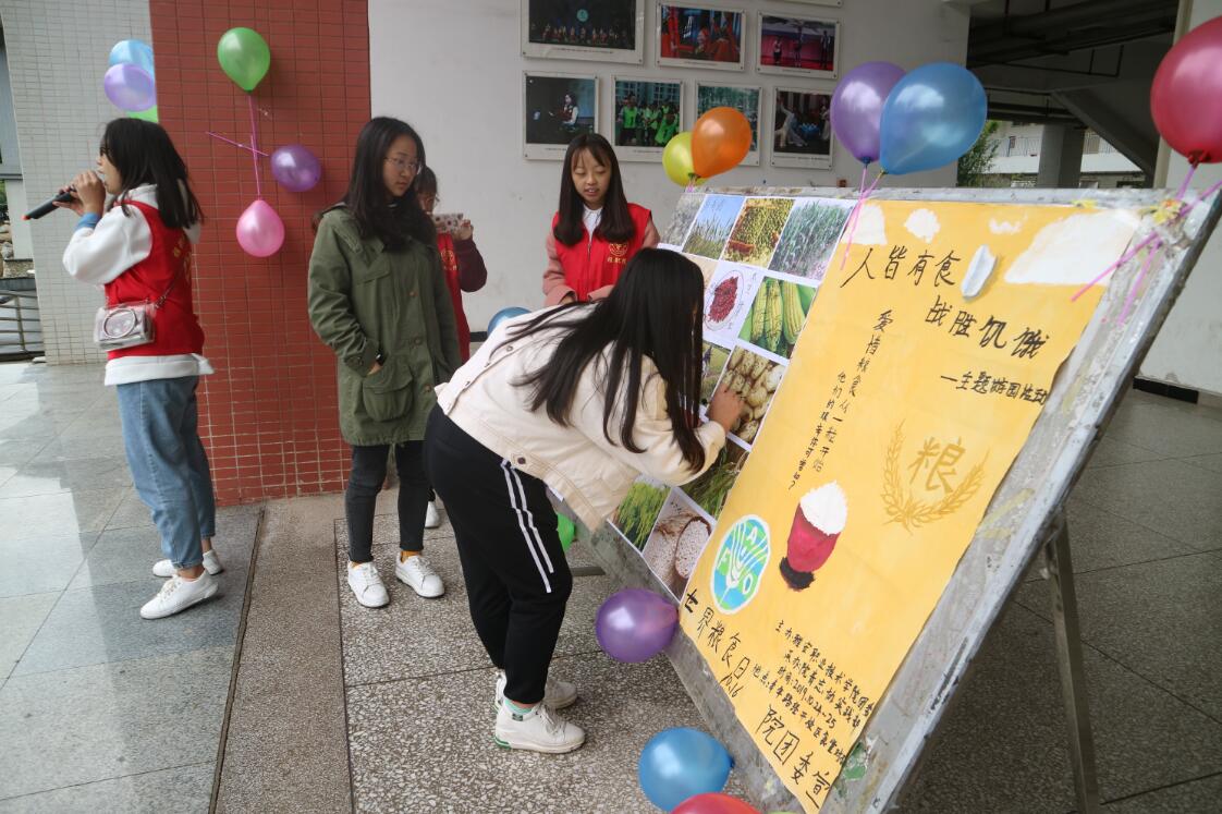 活动场地通过图片、实物、诵读文献的方式使学生们了解活动主题并积极参与其中。在活动中,主持人通过诵读1942年中原大饥荒的相关文献,让参加活动的同学通过文字感知了饥荒曾经为中国人民带来的巨大伤害。同学们在观看完文献图片、实物展区的粮食后,对粮食的重要性有了更深刻的认识,直观了解了我国目前的农业现状,体会到祖国的强大。