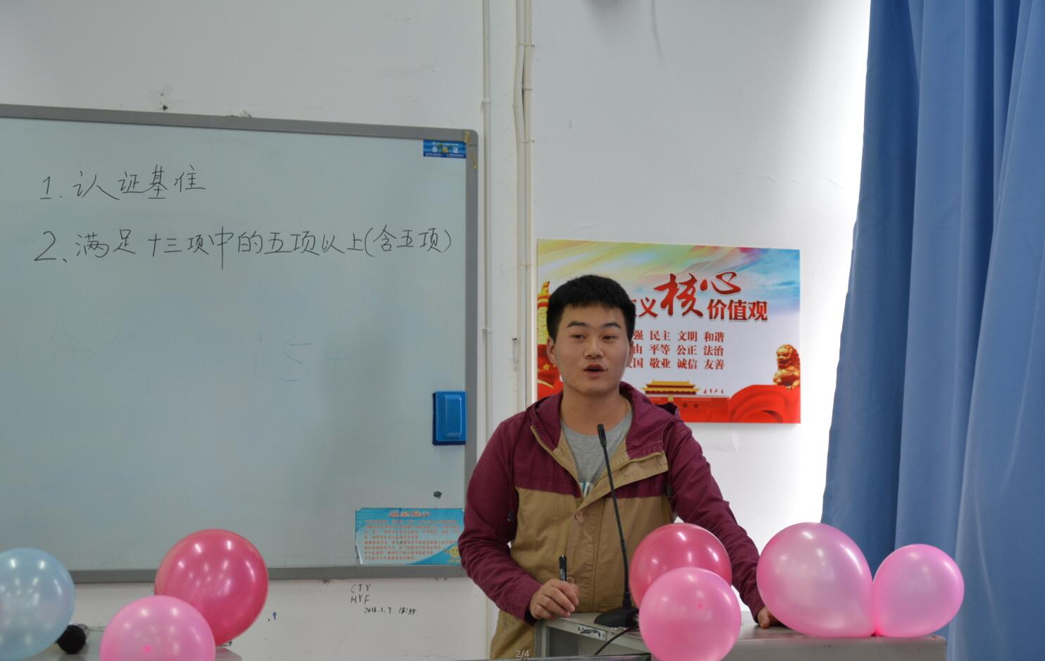 主讲人陈实同学详细讲解了四川省大学生综合素质A级证书的认证机构、认证目的、认证对象、认证条件和认证办法、认证程序、及申报注意事项,同时他还以问答的方式为大家进行了现场答疑,鼓励同学们充分利用大学平台,不断追求卓越,要有争先创优的精神,积极进取,努力学习和工作,争取创造条件获得“四川省大学生综合素质A级证书”。