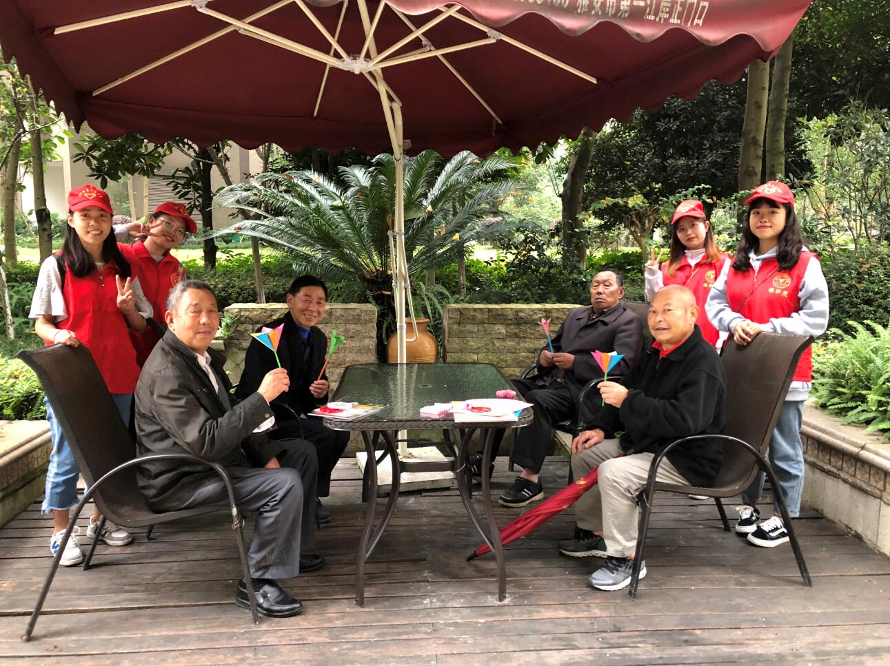 老人们对我们的到来表示十分欢迎,也十分亲切。志愿者们也热情高涨的为老人们讲述重阳节的来历。随后志愿者们同老人一起做手工、聊天、唱歌等互动活动。活动结束以后志愿者和老人们深情告别。最后志愿者们在小区中央花园门前合影留恋。
