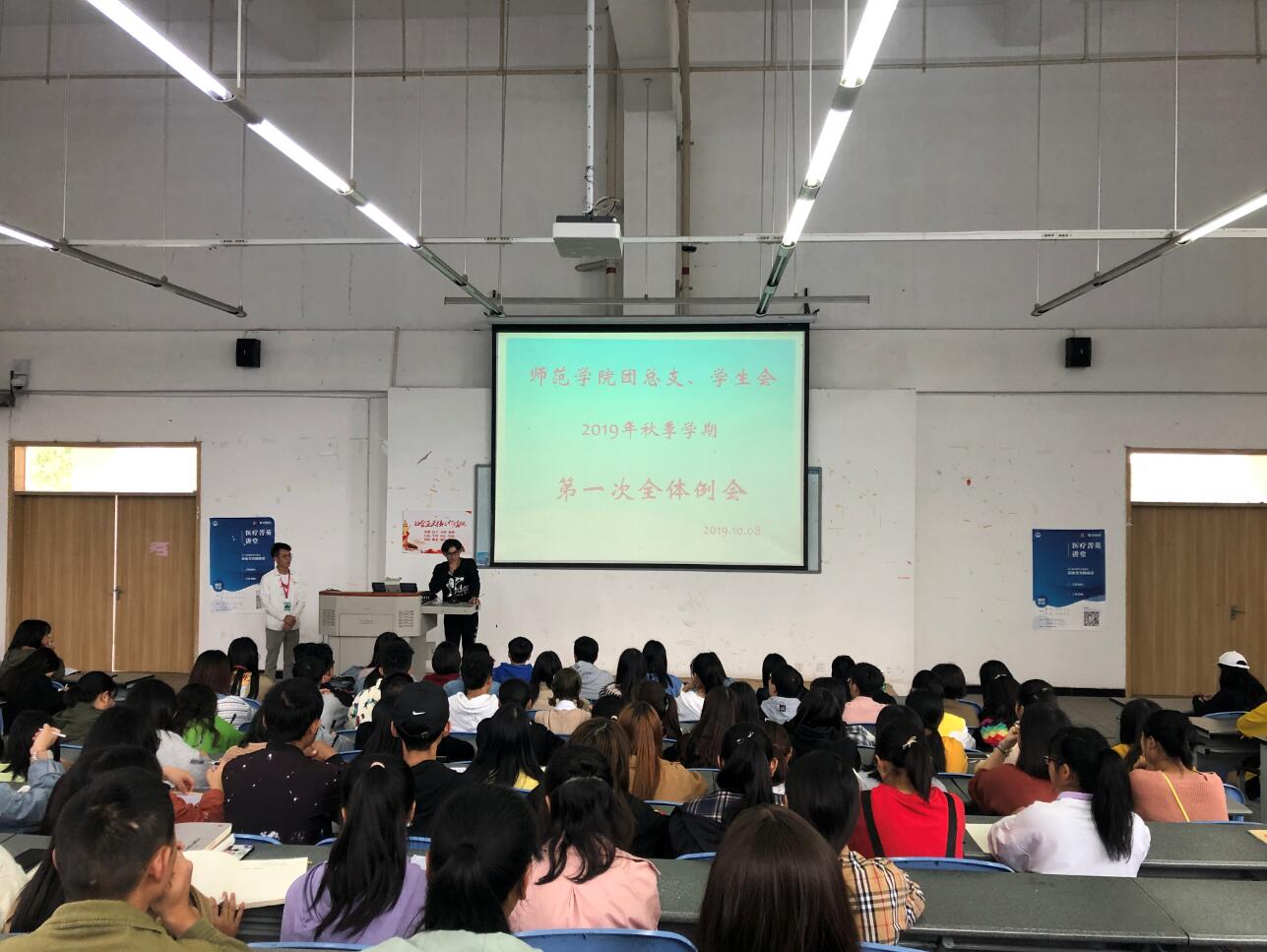 10月8日中午,师范学院团总支、学生会在青年路校区图阶102召开2019年秋季学期第一次全体例会。师范学院团总支书记左习成老师、主席团全体成员、各部门部长以及2019级全体学生会干事参加,会议主要对新入选干事介绍学生会工作以及相关要求。会议由团总支副书记王涛主持。