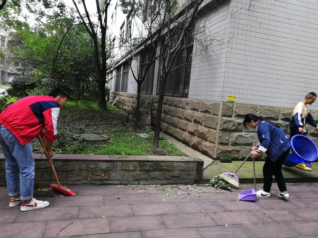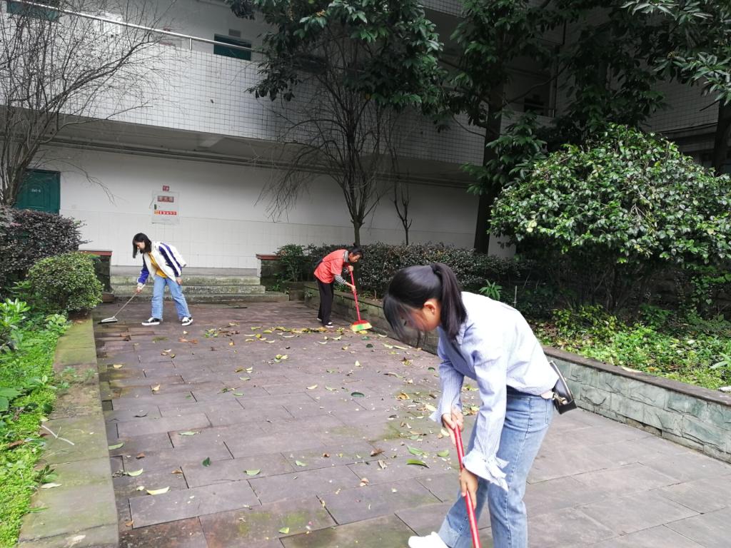 负责人清点人数分组、分发清洁用具,分别对教室和庭院开展清扫工作。由于不少教室的黑板上有长期循环使用导致黑板存在擦不干净的情况,一组志愿者们花费不少功夫将黑板清理干净,同时也将教室里的桌椅擦拭干净。另一组志愿者清扫庭院地上的落叶以及新生分发书籍留下的各种垃圾。最后,检查完教室以及庭院的卫生后,志愿者们来到图书楼门口合影留恋。