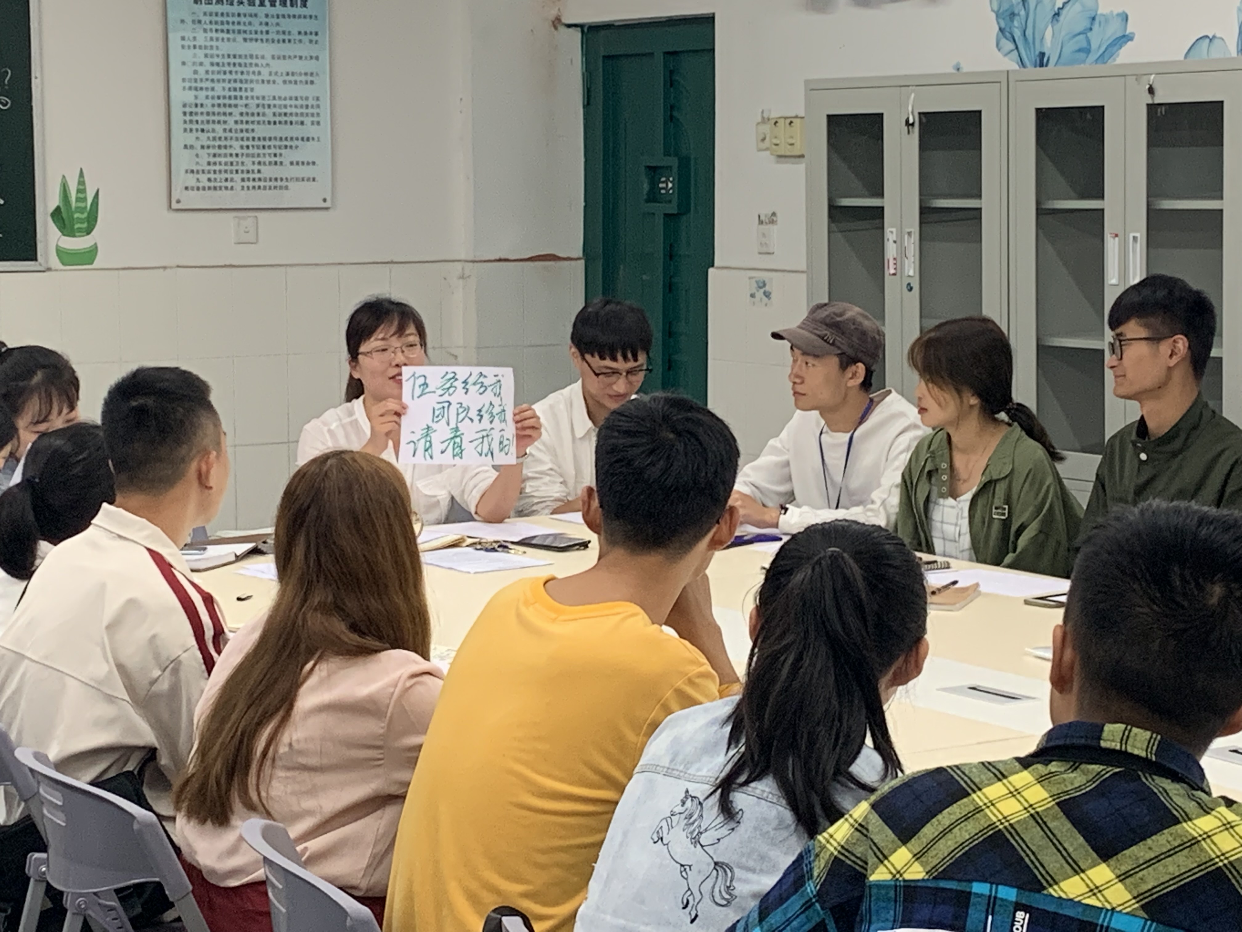 会议最后,刘永恩老师组织大家开展了一次“团建”活动,让大家在思考工作之后,用一句话总结前期工作的感受,并于身边的同伴进行分享,在得到同伴的一句话肯定后,增强了前行的动力。现场的老师和同学经过深入走心的交流后,老师们给出了“爱工作,带团队,让我来!”,全体同学学生干部给出了“任务给我,团队给我,请看我的!”郑重承诺。