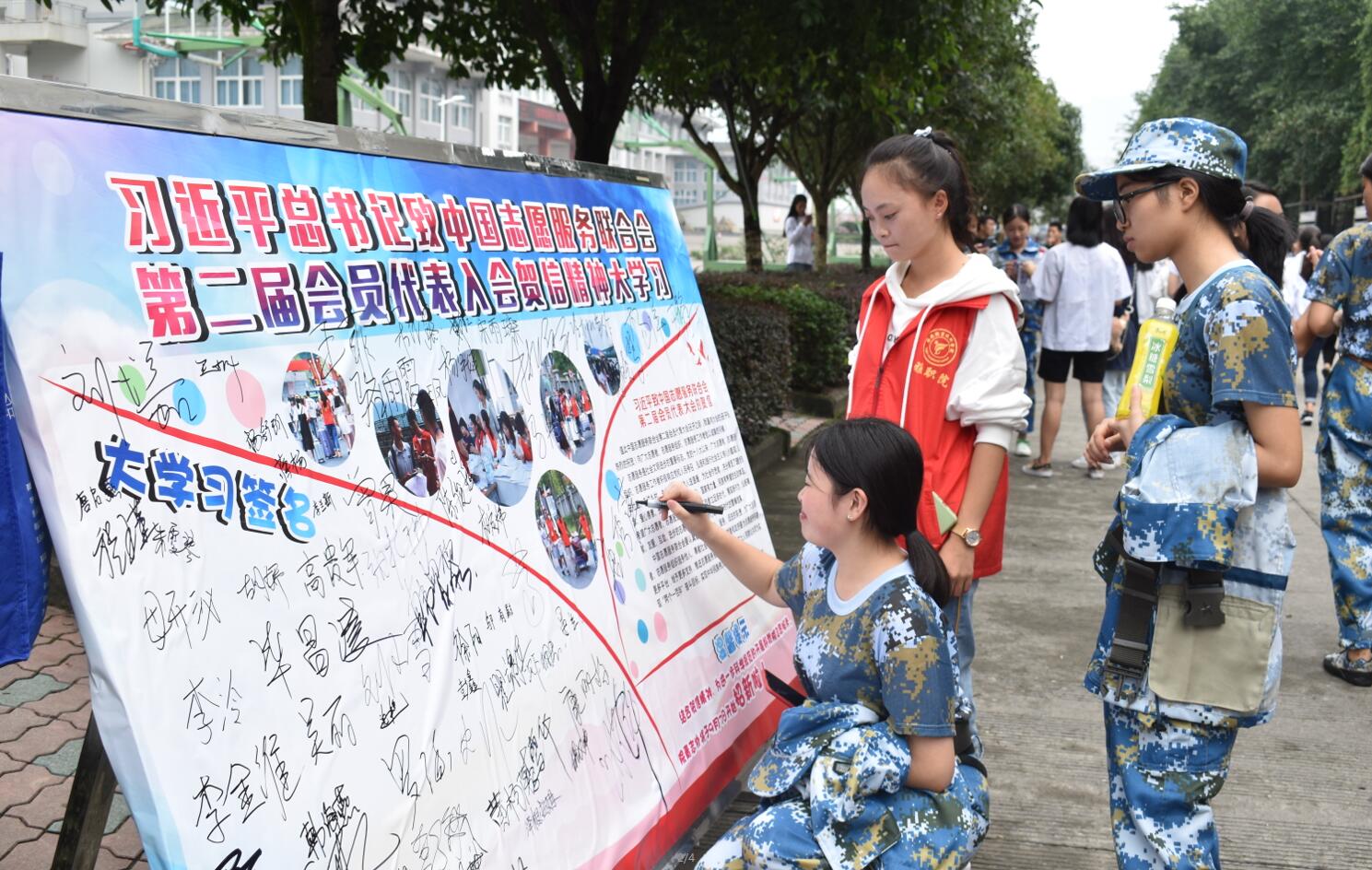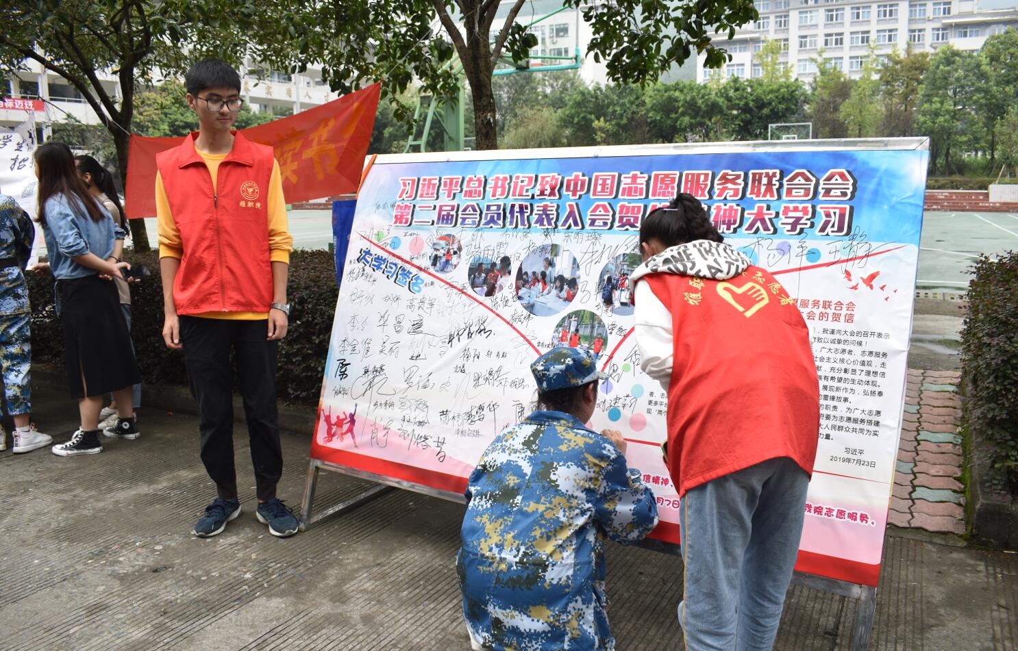 习近平总书记在贺信中提到“希望广大志愿者、志愿服务组织、志愿服务工作者立足新时代、展现新作为,弘扬奉献、友爱、互助、进步的志愿精神,继续以实际行动书写新时代的雷锋故事。”在展板推出后,许多同学前来询问,围观,并仔细阅读“习近平致中国志愿服务联合会第二届会员代表大会的贺信”,经志愿者介绍后,纷纷在大学习签名区签上了自己的名字。