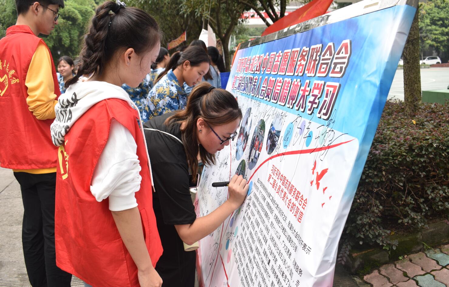 为深入学习领会习近平总书记贺信精神的丰富内涵。9月6日,“习近平总书记致中国志愿服务联合会第二届会员代表大会贺信”精神大学习签名活动在学院青年路校区食堂门口举行。