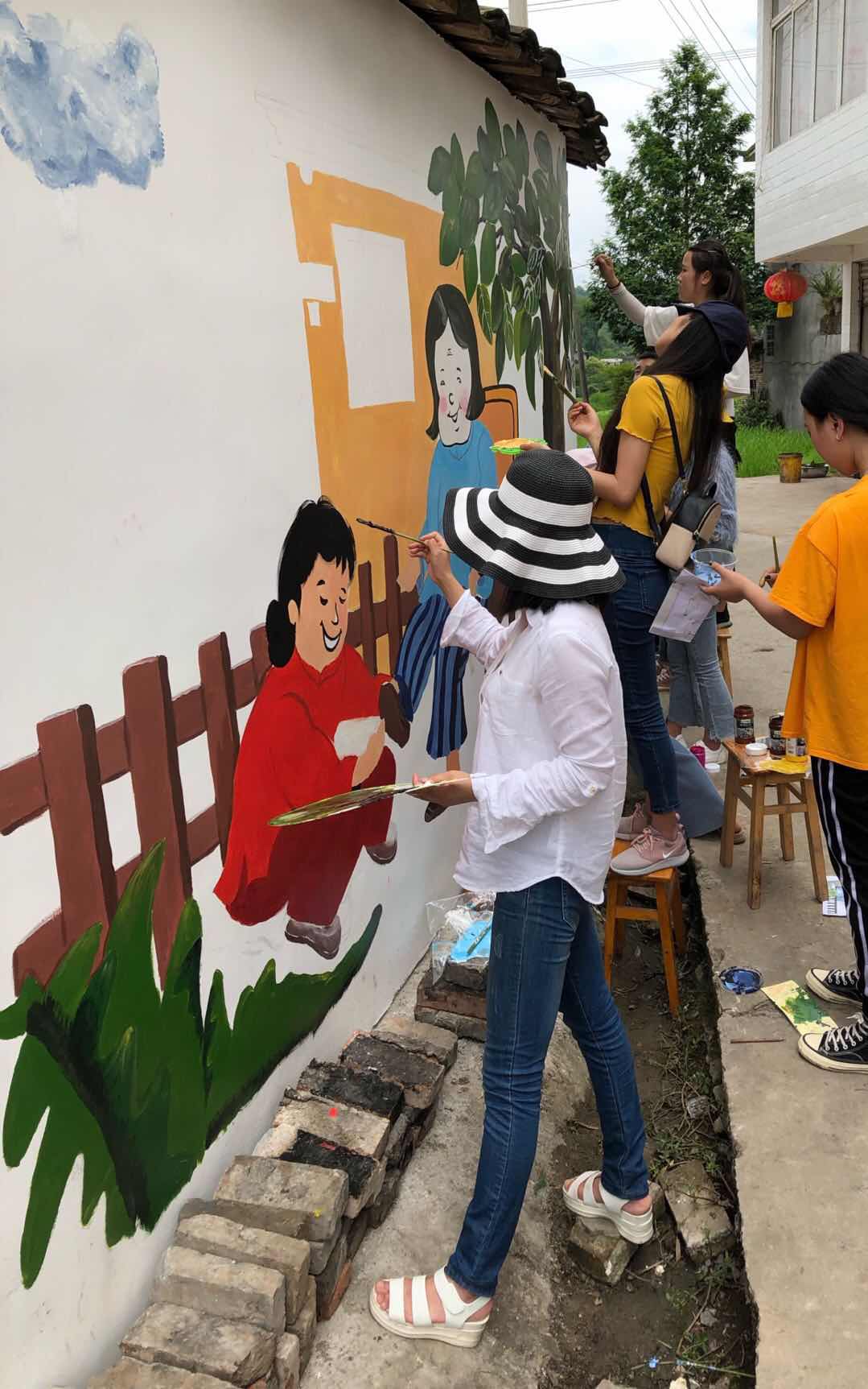 学院老师运用自己的专业特长,带领学生志愿者们在洁白的墙面上填充色彩,尽管是在砖墙上绘制,师生志愿者们依旧像创作最满意的作品那样一丝不苟。炎炎烈日下,经过师生们一天的细心绘制,文化墙全部完工。一面面多彩文化墙让村民在潜移默化中感受到“文化扶贫”给村容村貌带来的变化,成为该村一道亮丽风景。