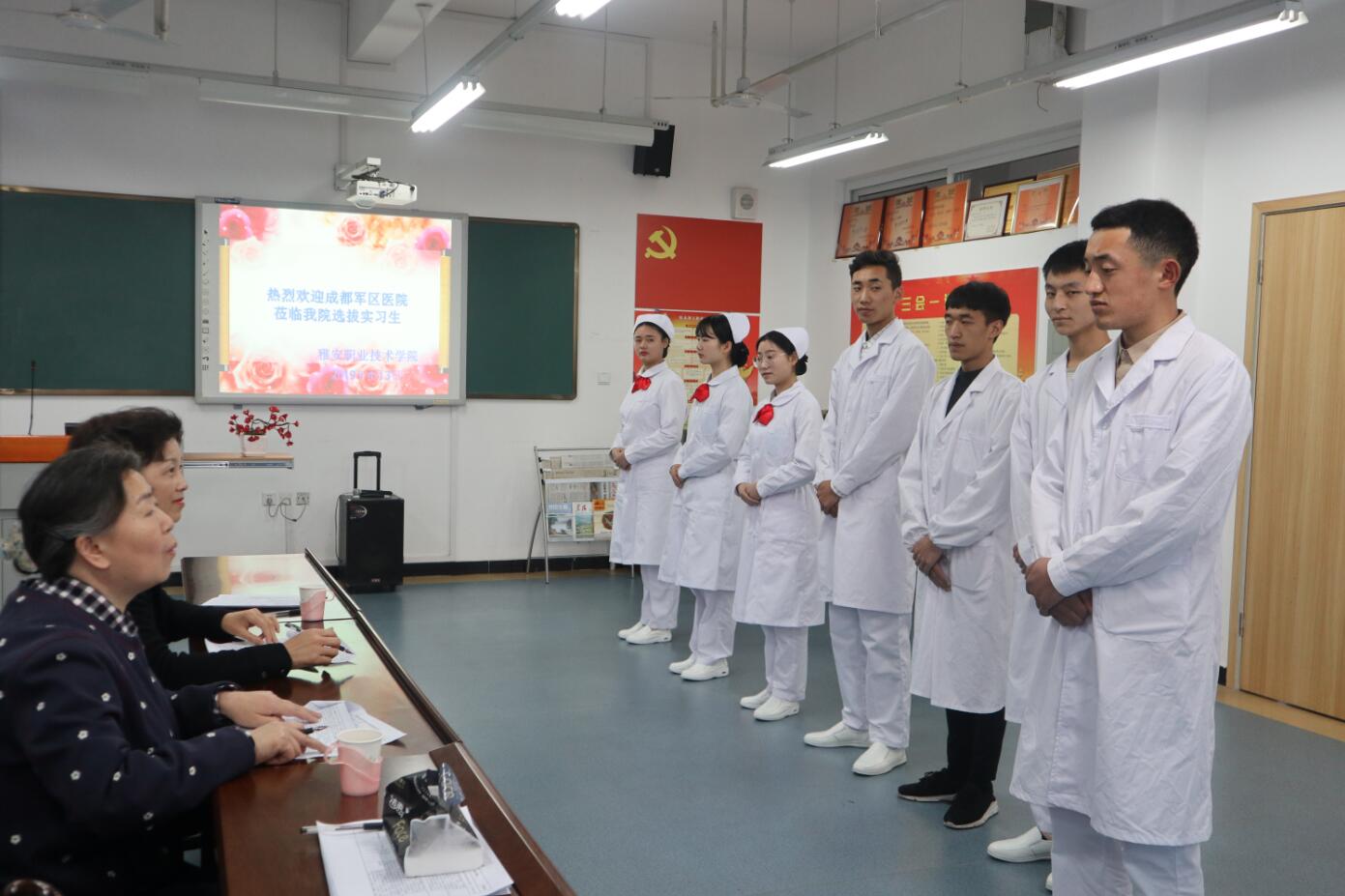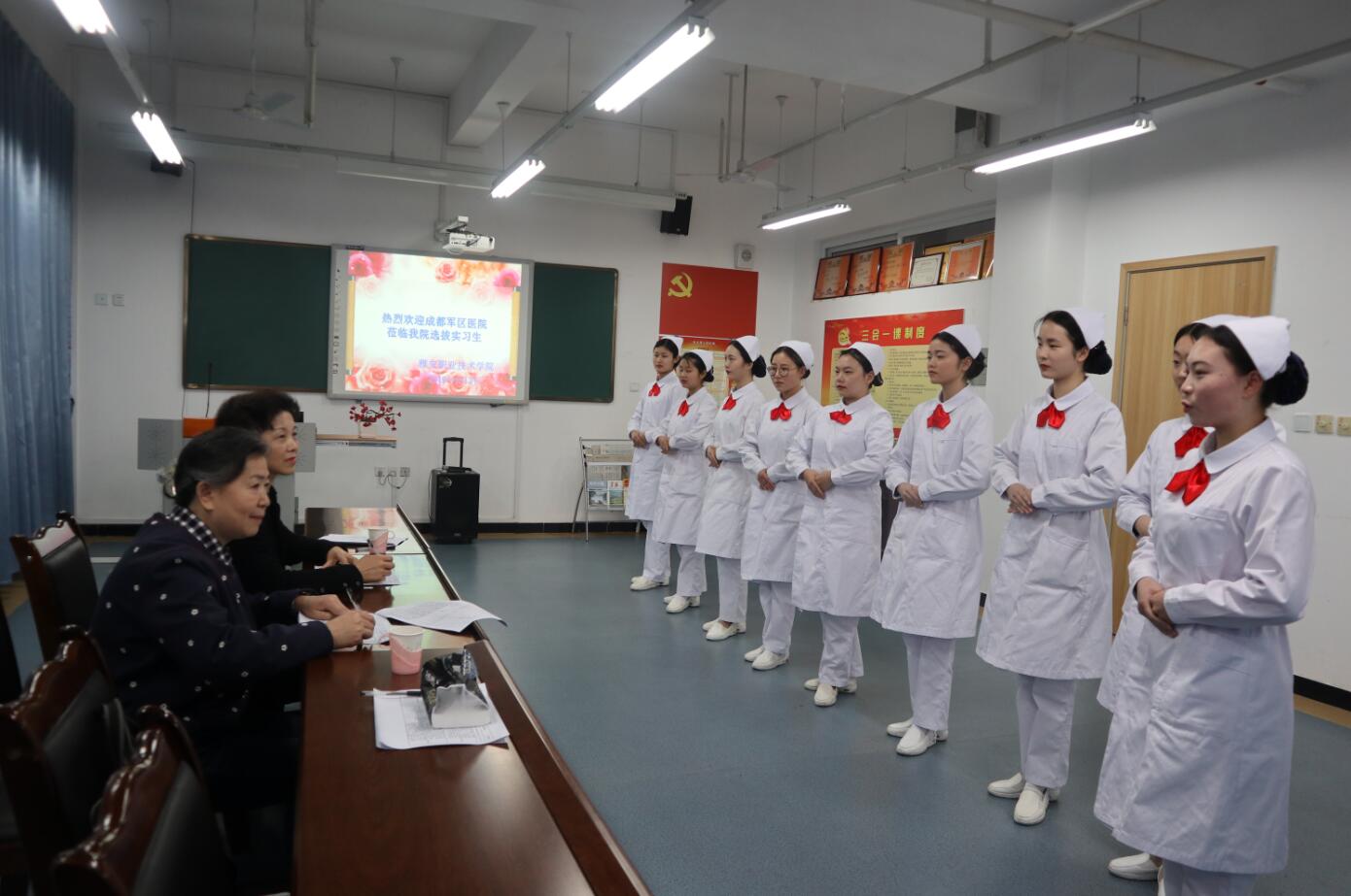 4月3日,成都军区总医院主任护师王英和总护士长熊碧君莅临我院选拔护理专业实习生,面试工作在青年路校区实训楼607进行,共有144名同学参与选拔。