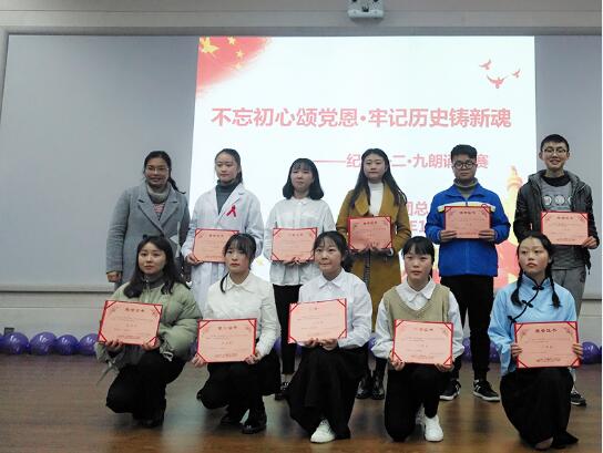 决赛在一首《纪念碑》中拉开了帷幕,整齐的民国学生装,铿锵有力的朗读声,抒发着爱国之情。每组选手各有风格,朗诵内容积极向上,有单打独斗,也有团结协作。看着一幕幕回忆历史的背景图片,听着参赛选手时而激情,时而悲亢的朗诵,大家仿佛回到了1935年的12月,一声声“反对华北自治,反抗日本帝国主义,保全中国领土的完整……”的豪言壮语回荡在耳边。《我亲爱的党》为此次比赛划上了完美的句号。比赛结束,由陈静老师对本次比赛进行总结,陈老师肯定了大家的创意和努力,提出了参赛选手的不足之处。