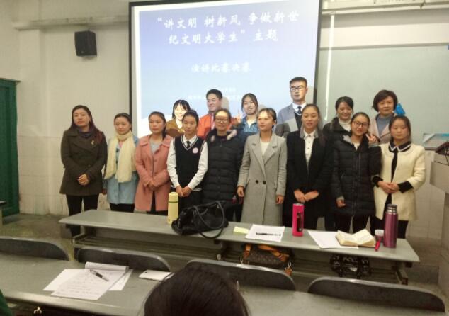 【本网讯】为了提高大学生文明素质,增强讲文明树新风意识, 11月8日,教育系团总支、学生会在B305举办了以“讲文明、树新风, 争做新世纪文明大学生”为主题的演讲比赛。教育系老师钟宏颖、杨柳、岳宁出席活动并担任现场评委。