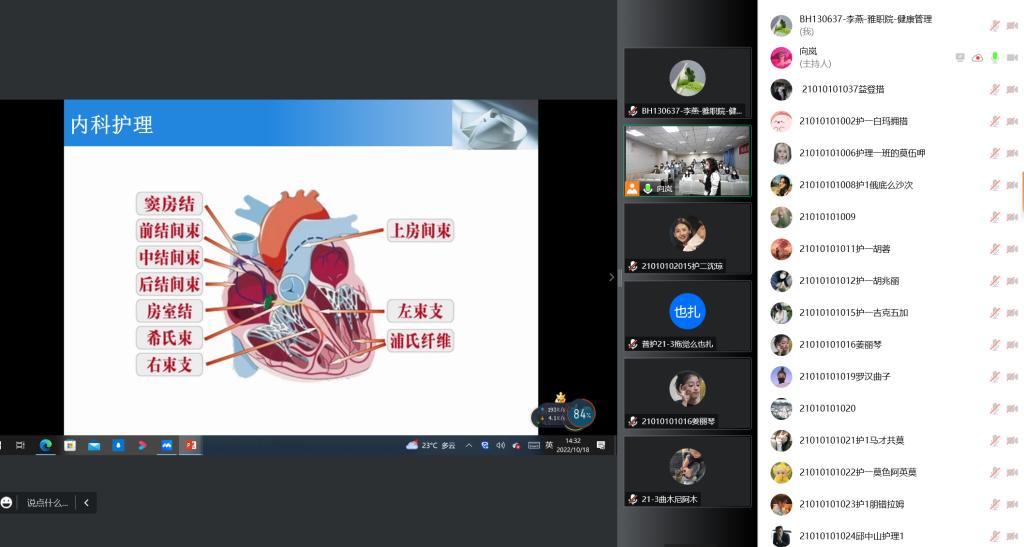 本次课的教学内容选自《内科护理》的心律失常病人的护理,在课堂上,教师采用幽默的语言,激发学生学习兴趣,结合画图学习法和口诀让同学们轻松掌握本节课重难点,本次同步课堂上课形式新颖,促进两校教师交流与学习,得到两个学习同学及听课教师一致好评。