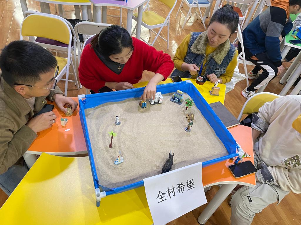 参加活动的辅导员老师通过随机抽签,分为了“全村希望”和“无欲无求”两个小组,跟随老师的讲解和组织,辅导员老师们在放松的状态下接触沙子,感受沙子的质地、温度、粗细,放下心中的戒备。在了解沙盘游戏的基本操作步骤后,小组成员通过不同的方式确定游戏顺序,然后依次完成“动作”:或选取沙具摆放,或移动沙具,或利用沙子摆出形状。整个过程中,成员之间不用任何言语或非言语的交流,直到完成整个沙盘作品。最后沙盘中呈现出一个个画面感极其丰富的场景。