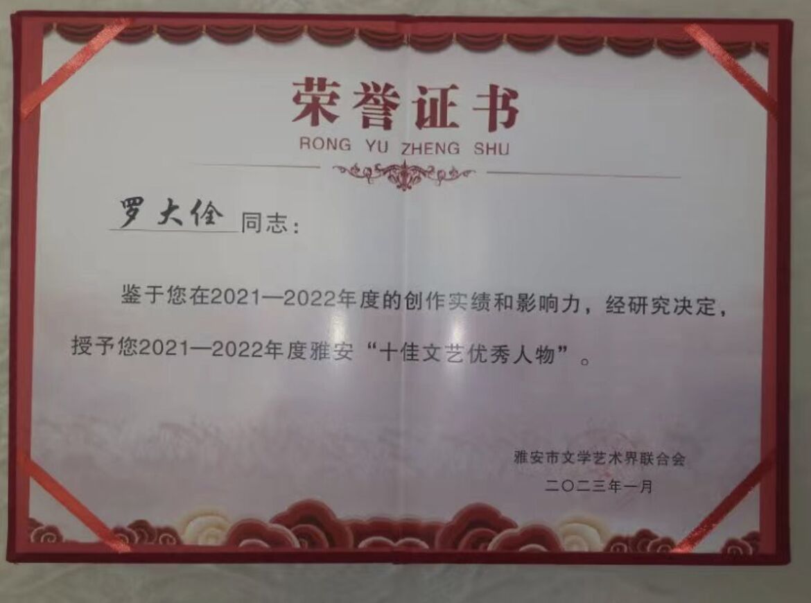 该奖项是雅安市委宣传部、雅安市文学艺术界联合会为表彰2021-2022年度文艺界坚守初心、为民创作、积极投身文艺志愿服务、自觉践行文艺界核心价值观和职业道德公约并做出成绩及贡献的文艺工作者而颁发的,是雅安市文学艺术的最高奖项。