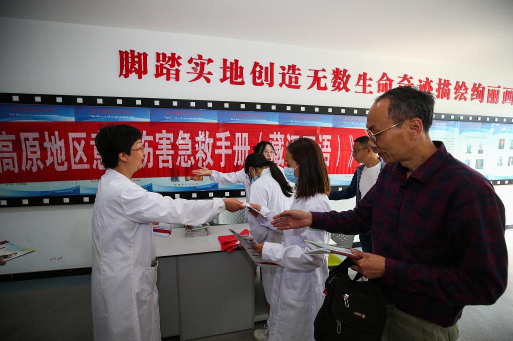 最后,基础医学院直属党支部书记孙玉锦代表编委会向群众赠送了由我院教师主编出版并入选2023年国家农家书屋重点出版物推荐目录、2022年四川省农家书屋重点出版物推荐目录的医学漫画科普图书《高原地区意外伤害急救手册(藏汉双语)》。