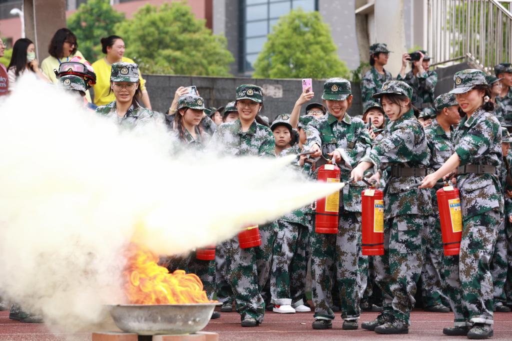 此次活动包括现场应急避险消防疏散演练、认识消防特勤器材、消防灭火三部分。下午2时40分,演习正式开始,宿舍楼冒出滚滚浓烟。发现火情后,消防警报即刻被拉响,学生按照多条疏散路线有序撤离,全程用时仅五分钟;消防车也在4分钟内抵达校园烟雾处,高效有序开展救援。随后消防员向大家展示了较常用的消防破拆工具,讲解并演示了灭火器的使用方法,同时邀请老师、同学们体验使用灭火器灭火。