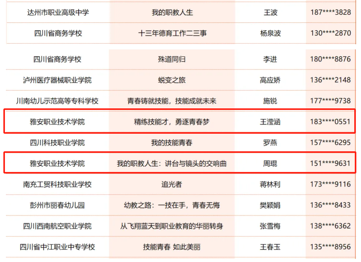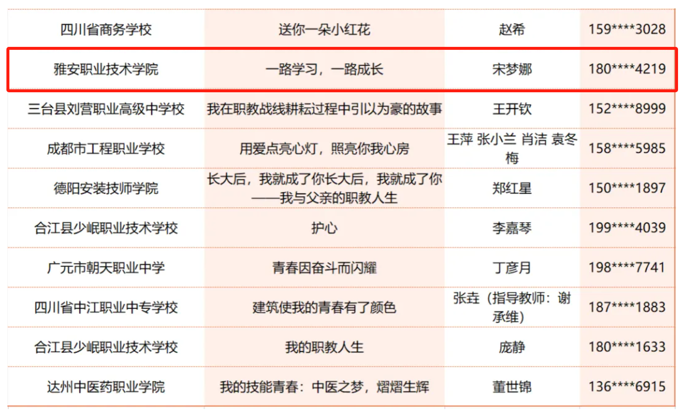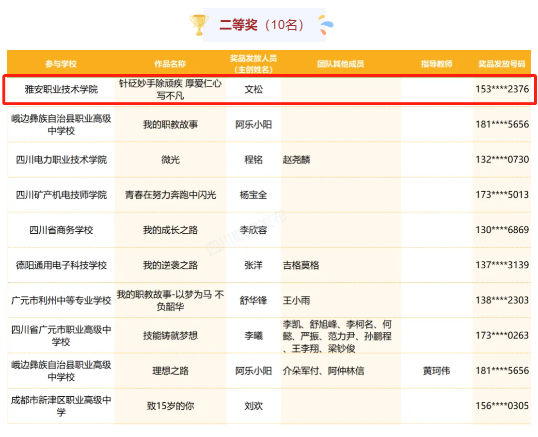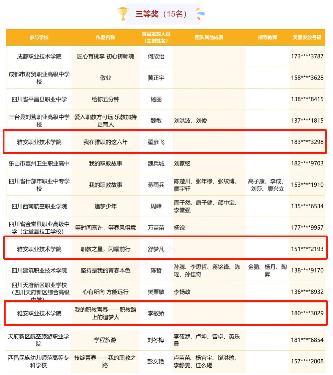 在“我的职教故事”微电影(短视频)作品征集活动中,我校亦成绩斐然。经过初审、复审以及专家评审,全省共有45部作品获得奖项。我校作品《针砭妙手除顽疾 厚爱仁心写不凡》荣获二等奖,《我在雅职的这六年》、《职教之星,闪耀前行》、《我的职教青春—职教路上的追梦人》三部作品荣获三等奖。