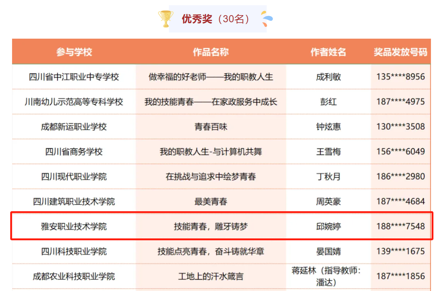 在“我的技能青春/我的职教人生”征文大赛中,我校6篇作品从近千份稿件中脱颖而出,荣获1项二等奖、3项三等奖及2项优秀奖。其中,《上好一门课,当好一“人师”》一文荣获二等奖;《精练技能才,勇逐青春梦》、《我的职教人生:讲台与镜头的交响曲》、《育一粒种子,生出希望的花》分别荣获三等奖;《技能青春,雕牙铸梦》与《一路学习,一路成长》则荣获优秀奖。这些作品以其深刻的内涵、生动的叙述和鲜明的个性,展现了我校师生对职业教育的热爱与追求,以及他们在技能学习与实践中的丰硕成果。