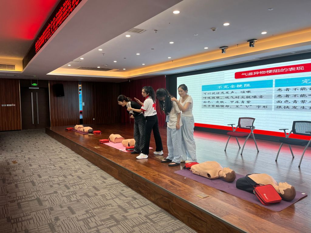 培训会现场,中国红十字会救护培训师黄丹和伍静薇老师作为主讲,普及了红十字运动知识、现场救护和心肺复苏等基本知识,演示了心肺复苏、AED使用、气道异物梗阻的急救程序和操作技术。现场学员积极参加学习,老师手把手讲解胸外按压技巧、AED使用、气道异物梗阻等急救技术。