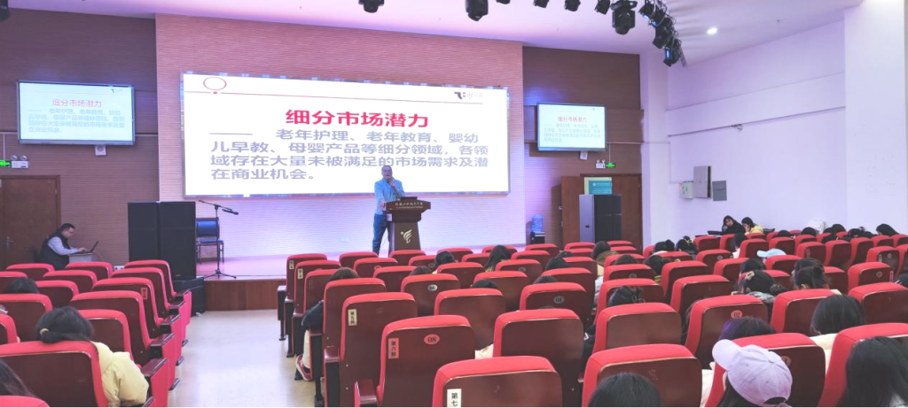 随后,张宏凯导师以“‘一老一小’行业的创业挑战与机遇”为主题,热情洋溢的开展了知识讲座。张宏凯导师首先结合目前老龄化与少子化现状,深入浅出的为学生讲解了老年护理、婴幼儿早教、母婴产品等“一老一小”行业的市场机遇和市场潜力;然后,张宏凯导师深度剖析了女大学生在创业中拥有的善于沟通、耐心细心、感知力强等方面优势和可能存在的社会偏见、资金压力、家庭与事业平衡等方面的挑战,并分享了应对挑战的策略;最后,张宏凯导师结合真实创业案例和自己多年经验,详细解析了如何进行创业项目规划、产品与服务设计等。知识讲座为学生提供了清晰的创业思路和方向,激发了学生的创业热情和信心,提升了学生的创业能力,鼓励了学生实现个人价值和社会价值的双重提升。