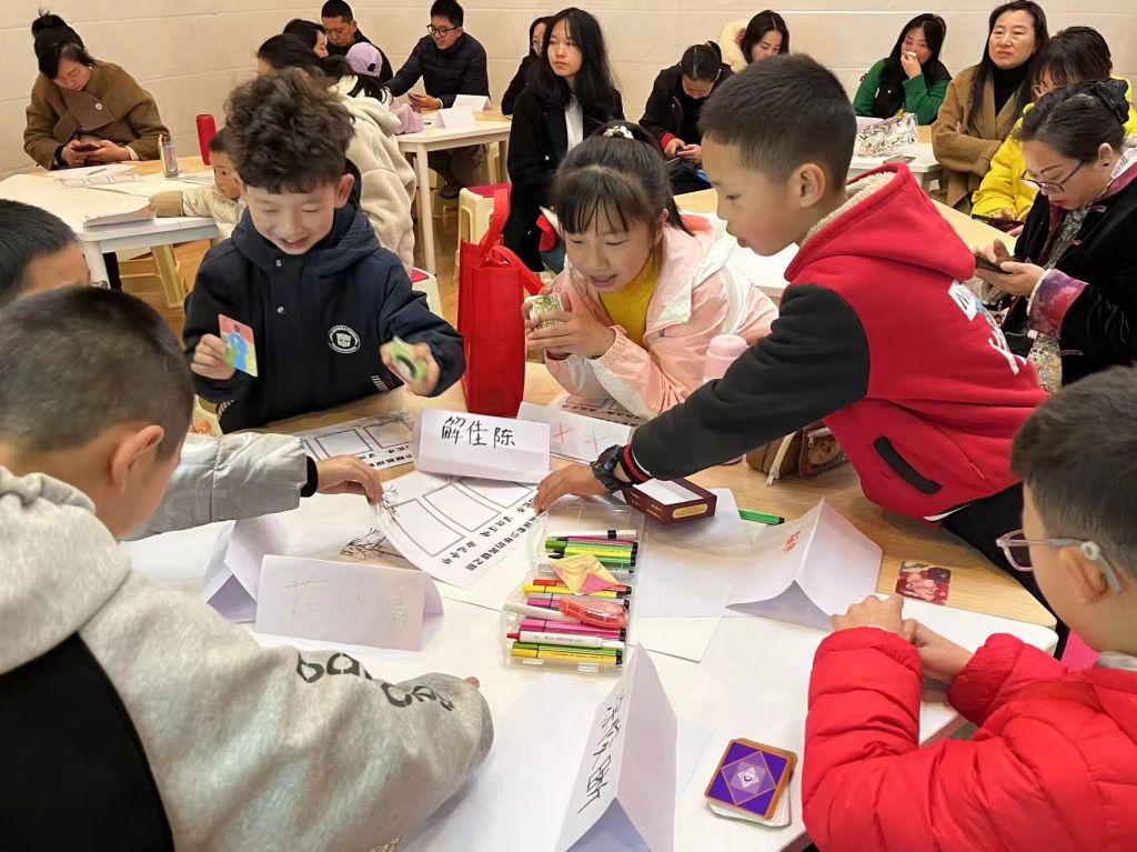 启动仪式上,学校心理健康教师王丽以中华经典《西游记》为媒介,通过“与唐僧隔空对话”、“谈西游记故事情节”的沉浸式共读等环节,引导18组亲子家庭在互动游戏中打破隔阂,为后续深度心理沟通注入温暖基调。随后,王老师运用OH卡投射技术开展“英雄之旅”故事续写。通过引导孩子们自主选择卡牌续写角色故事,帮助其具象化人生目标,在叙事过程中培养直面挑战的勇气。