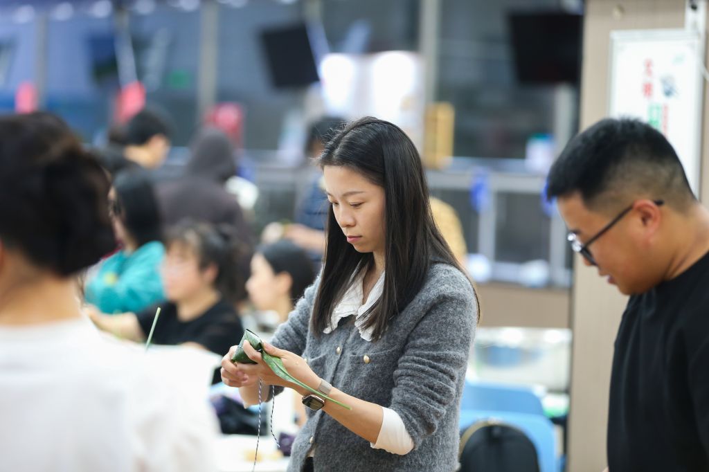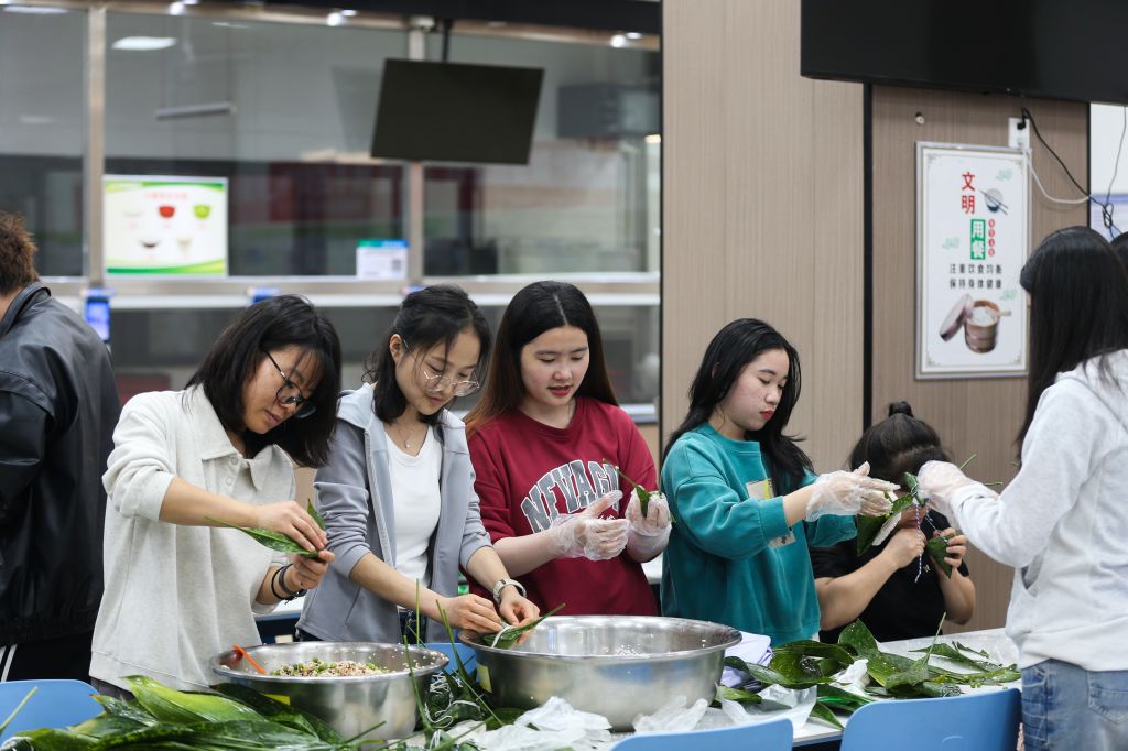 活动现场,粽叶飘香,气氛热烈。师生代表齐聚一堂、各显身手包粽子。活动得到后勤基建处的大力支持,食堂师傅提前准备好了粽叶、糯米、馅料等食材,老师和同学根据口味喜好调味、拌料。新手们围在经验丰富老师身旁学习请教,热心的能干人则手把手教学,在欢声笑语中,大家一边认真学习包粽子的动作要领、一边感受着端午节的独特氛围。活动中,师生们还自发地开展比速度、比工艺、比外形美观等小游戏,更增添了活动的趣味性。