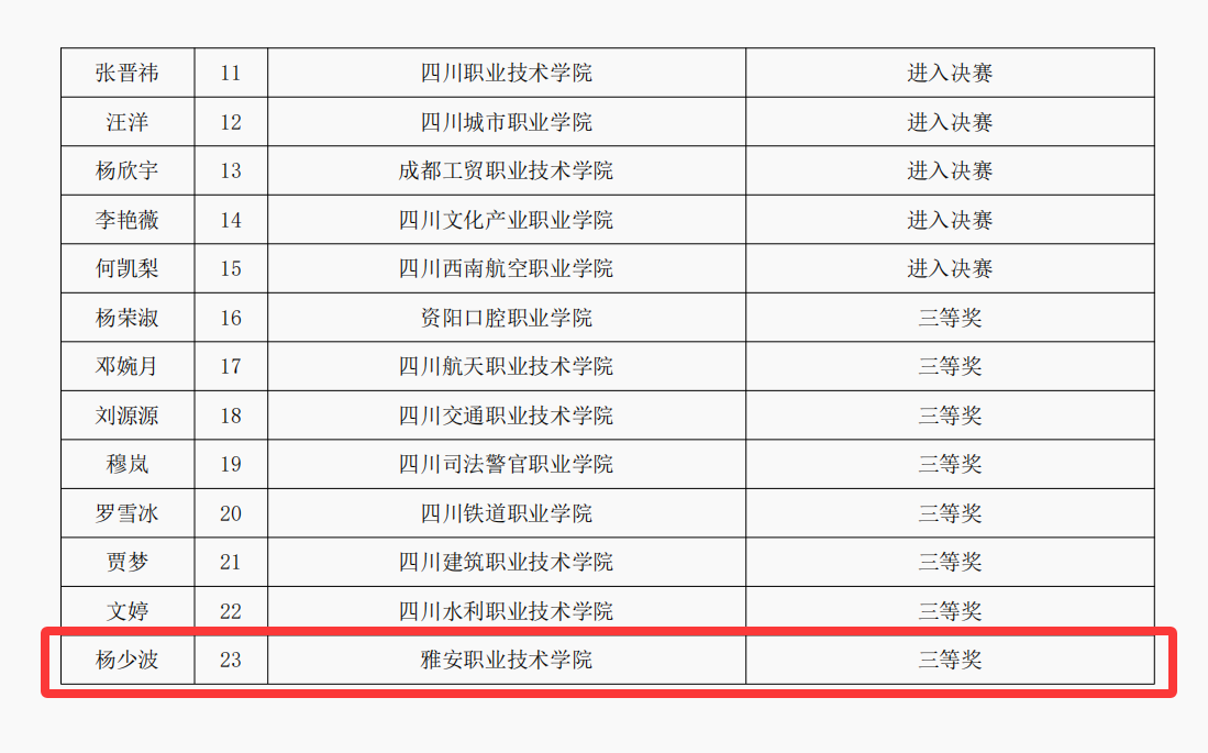 近日,四川省大中小学国家安全教育教学比赛复赛评审结果正式公示,我校马克思主义学院杨少波老师凭借作品《守护小包裹・保障大安全——争做总体国家安全观坚定践行者》,荣获高校专科(含高职高专)组三等奖。