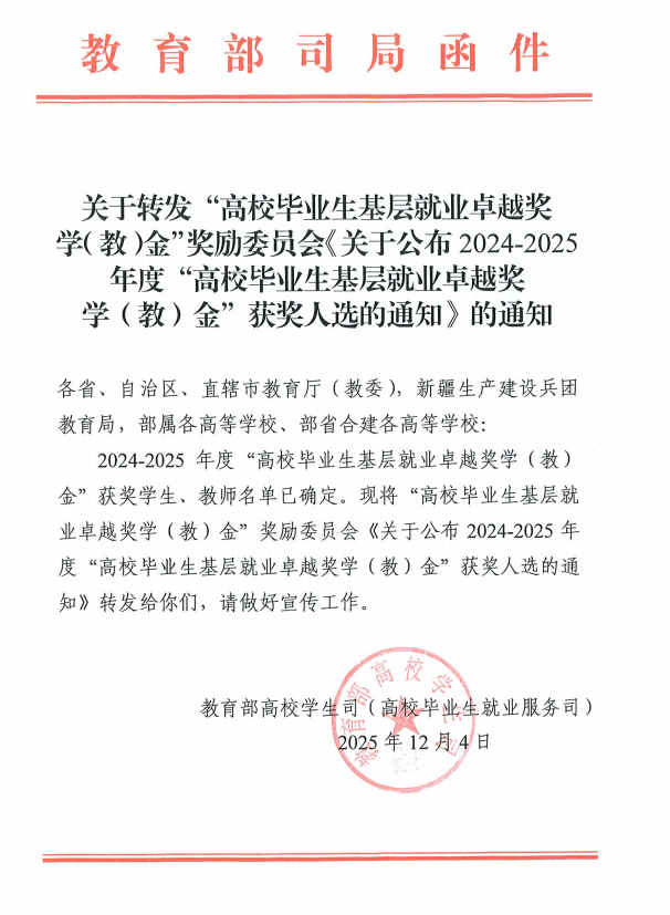 两份沉甸甸的荣誉,不仅属于优秀的毕业生个人,更属于培育他们的母校。他们积极响应“到祖国和人民最需要的地方去”的时代号召,在基层一线挥洒汗水、默默耕耘,用实际行动诠释了新时代青年的价值追求与责任担当,为母校增添了光彩,为青春写下了无悔的注脚。