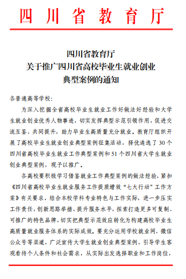 同期,在四川省教育厅组织开展的高校毕业生就业创业典型案例评选中,我校推荐的药学专业2024届毕业生杨太香的基层就业故事,成功入选省级典型案例,并获全省推广。