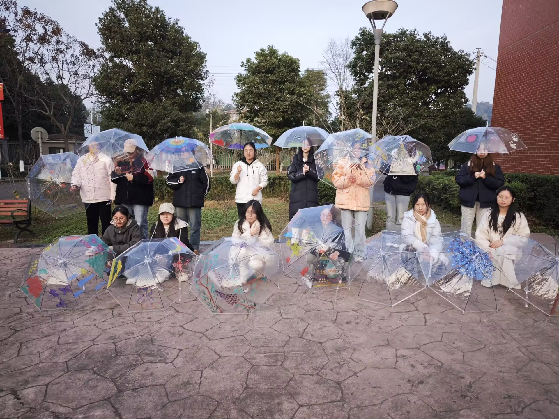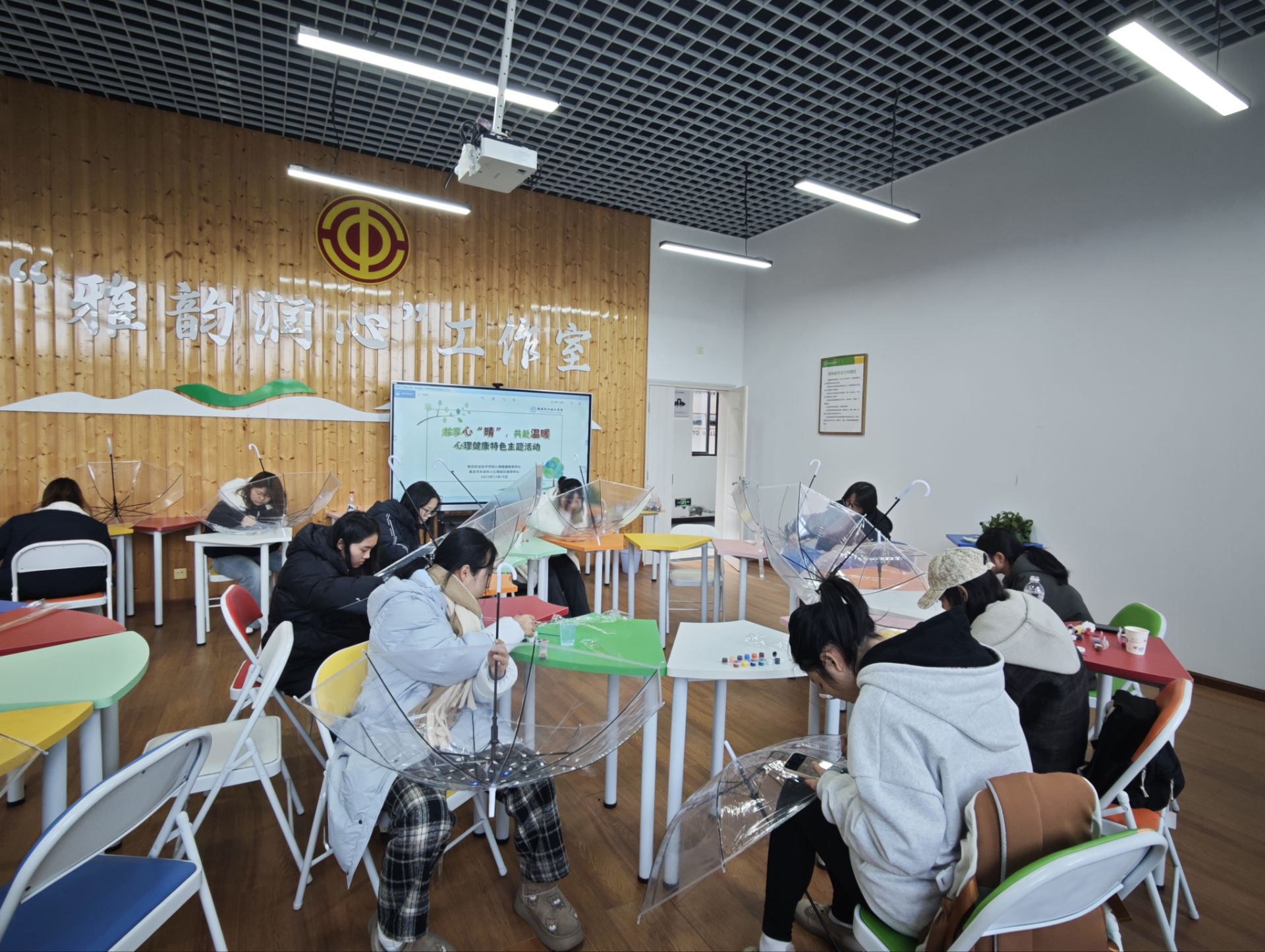 本次活动以彩绘透明雨伞为艺术疗愈载体,通过色彩表达与创意交流,搭建情绪表达与朋辈支持平台,引导学生在温暖互动中悦纳自我、积极生活。活动在冬日暖阳中拉开序幕,心理中心教师首先以“心灵天气猜猜猜”游戏暖场,活跃气氛并自然引入主题。随后,学生在伞面上自由创作,并通过作品分享背后的情感故事与心灵感悟。活动为学生提供了情绪表达与疏导的契机,也在互动交流中营造了温暖支持的良好氛围,助力学生积蓄心灵能量。