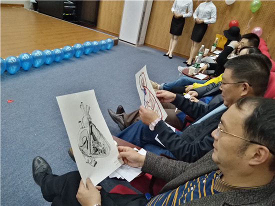 经过暖场知识问答后,绘画组展示了他们用精湛画技绘制的人体器官作品,让器官跃然纸上,栩栩如生,赢得满堂喝彩。评委们就纸张布局、器官结构、颜色搭配、位置关系,进行逐一讨论,让同学们获益匪浅。