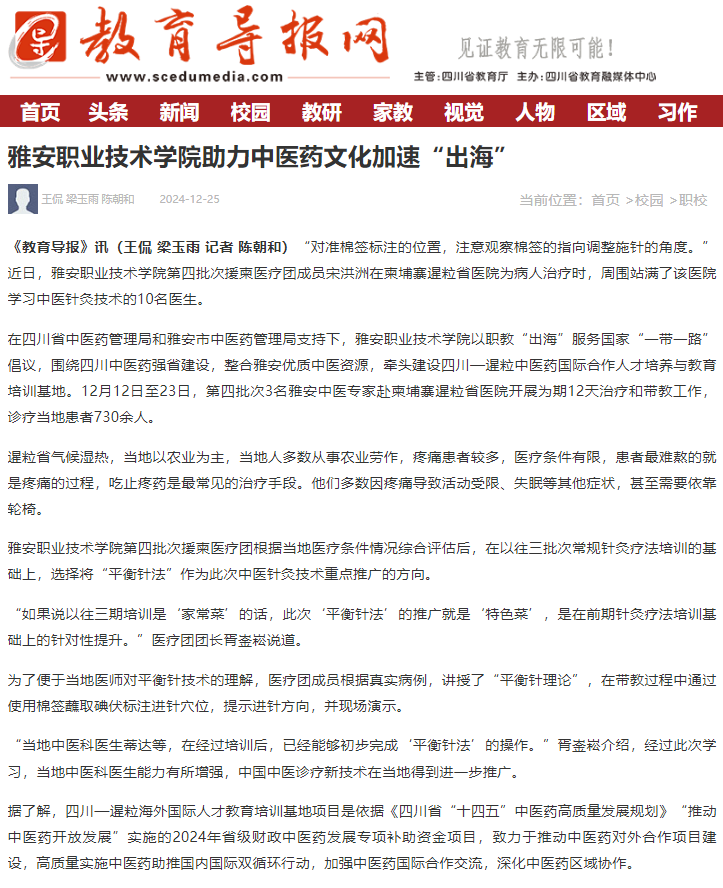 在四川省中医药管理局和雅安市中医药管理局支持下,Beat365唯一官方网站以职教“出海”服务国家“一带一路”倡议,围绕四川中医药强省建设,整合雅安优质中医资源,牵头建设四川—暹粒中医药国际合作人才培养与教育培训基地。12月12日至23日,第四批次3名雅安中医专家赴柬埔寨暹粒省医院开展为期12天治疗和带教工作,诊疗当地患者730余人。