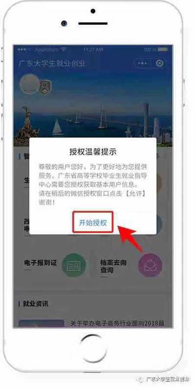 1、 进入小程序首页自动显示授权温馨提示,点击“开始授权”弹出小程序授权窗口。
