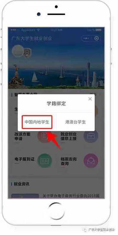 1、进入“广东大学生就业创业”小程序,在首页左上角找到“用户登录”,点击后出现一个弹窗,出现两个选项:“中国内地学生”“港澳台学生”,选择 “中国内地学生”选项。