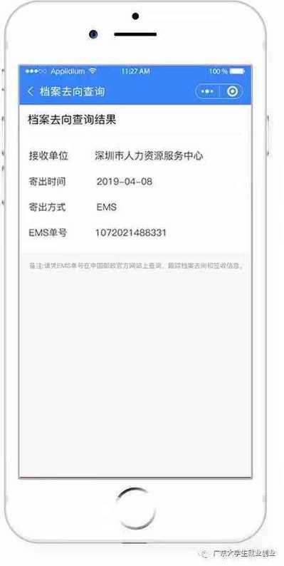 3、 在“广东大学生就业创业”小程序首页,可完成“档案去向查询”,可查询接收单位、寄出时间、寄出方式、EMS单号