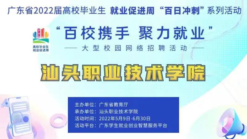 为贯彻落实党中央、国务院“稳就业”“保就业”决策部署,按照教育部办公厅《关于举办2022届高校毕业生就业促进周 开展“百日冲刺”系列活动的通知》要求,广东省教育厅会同全省高校,依托广东学生就业创业智慧服务平台(以下简称“平台”)开展“百校携手 聚力就业”大型网络招聘系列活动,诚邀广大用人单位参加本次招聘活动,活动具体安排如下: