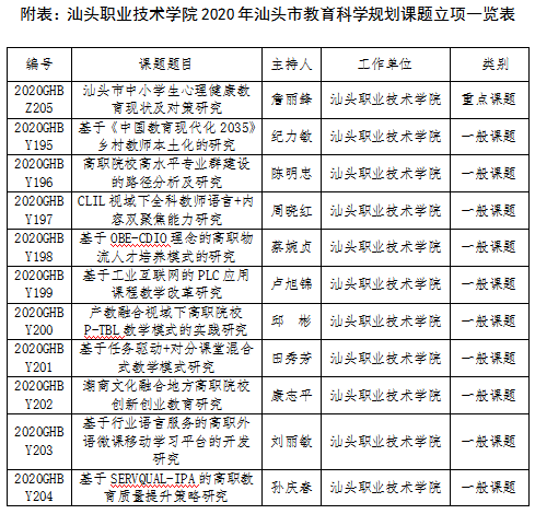 汕头市教育科学“十三五”规划2020年度课题于去年10月份启动以来,在学院领导的高度重视下,科研设备处积极组织,学院教职工踊跃参与,共收到24项课题的申报。这些课题以我市、我院当前教育改革和发展中的热点、难点问题作为课题研究的主攻方向,如乡村小学全科教师培养、新时代新高职高质量发展、新时代高职创新创业人才培养、高职院校人才培养模式改革、高职院校的课程改革或专业建设等,具有针对性、科学性和可行性。经形式审查、专家组初评,我院遴选出10项课题报送市教科规划办(另加市教育局委托课题1项)。