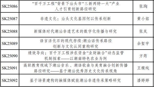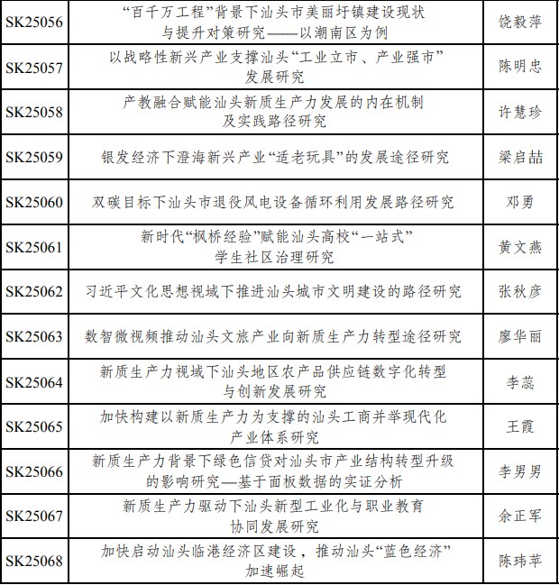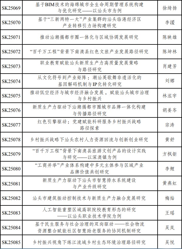 经汕头市社会科学界联合会批准,2025年度汕头市社科研究课题共有163项准予立项。必赢官网教职工共立项47项,占立项总数的28.8%。接下来,科研设备处将认真组织各立项项目负责人按计划高质量完成课题研究工作,积极服务汕头地方经济社会发展。具体立项名单如下: