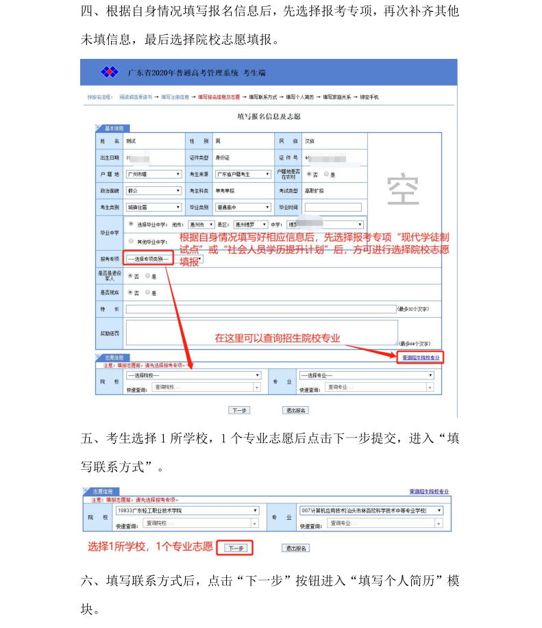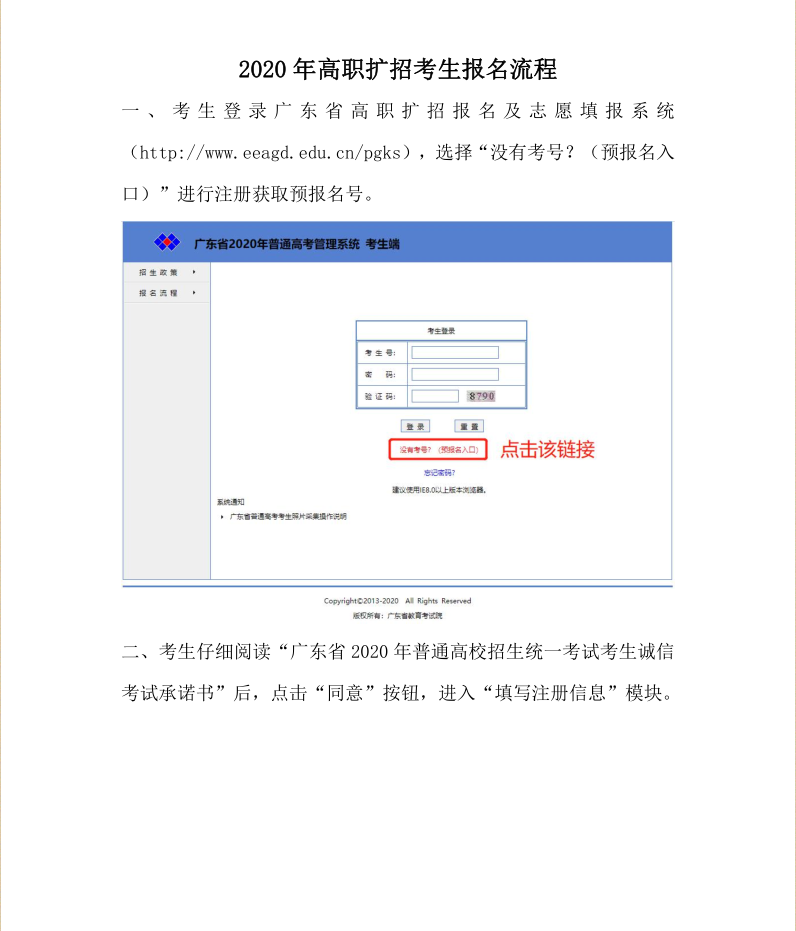 请有需要的考生按照以下2020年高职扩招考生报名流程图自助完成高考报名,如有疑惑之处请参看我院2020年高职扩招行专项动招生章简章http:/zs/2020/0929/c276a16285/page.htm,根据自己所报考的专业拨打相对应的教学点电话咨询